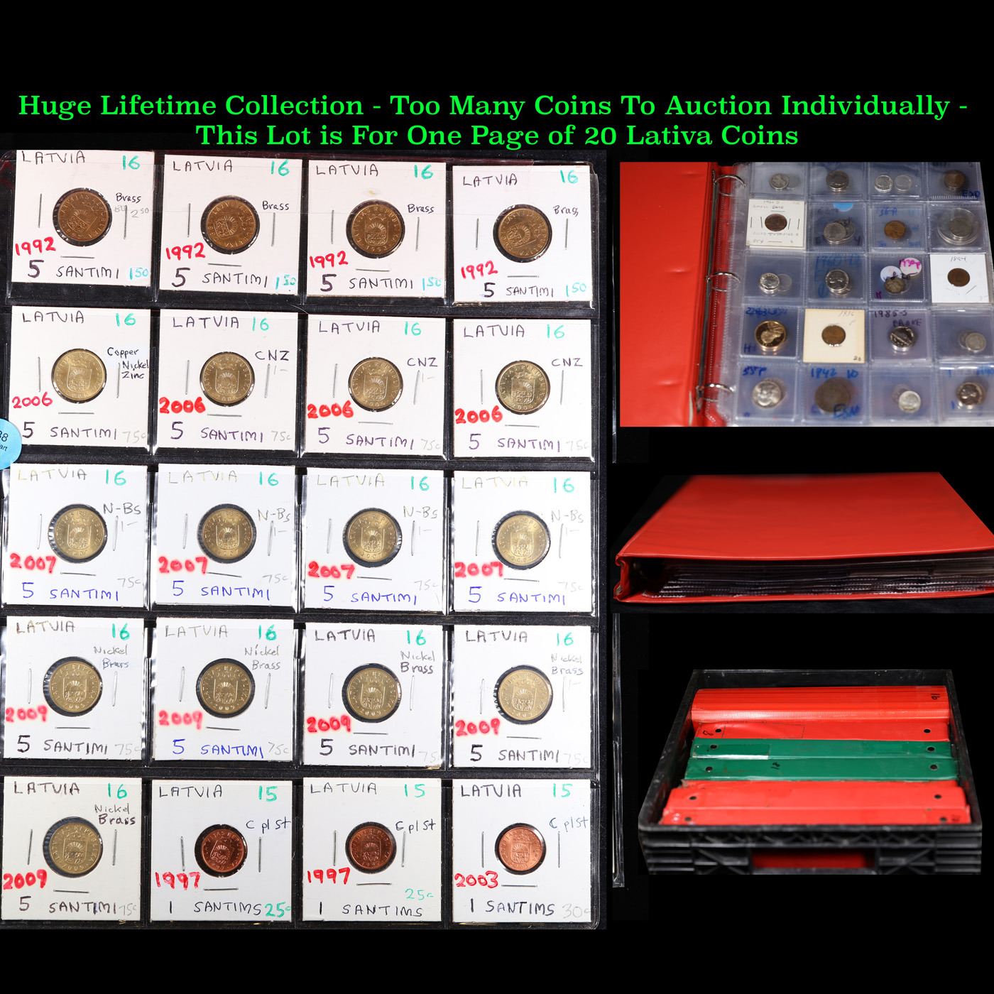 Huge Liifetime Collection - Too Many Coins To Auction Individually - This Lot is For One Page of 20 Latvia Coins. We have received a huge collection of over 10 thousand US coins in flips, 2x2 holders, and 20 coin pages. We are forced, due to limited lots, to sell this collection in pages of 20 coins. All of the pages include Silver Coins. Most contain Indian Cents, Proof Coins, Barber Coinage, Bust Coinage, Lincoln Cents, Flying Eagles, Jefferson Nickels, Roosevelt Dimes, Buffalo Nickels, Eisenhower Dollars, Kennedy Halves, Large Cents including some Draped Bust Large Cents, Mercury Dimes, and Liberty V Nickels. These pages could not be reviewed by anyone in our office due to time constraints. We estimate the value of each page to meet or exceed $200 in value! Good luck and happy hunting.