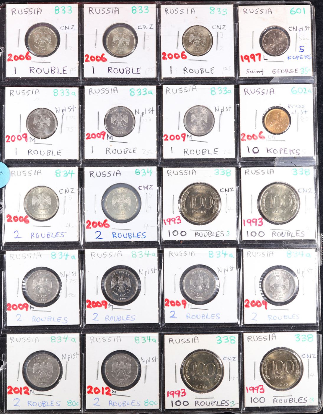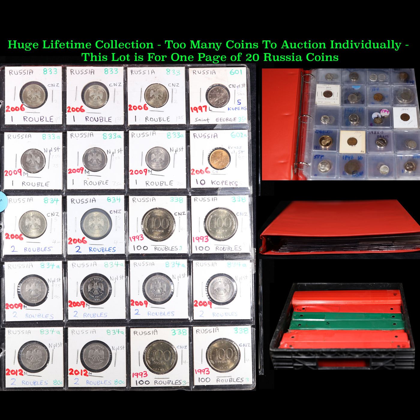 Huge Liifetime Collection - Too Many Coins To Auction Individually - This Lot is For One Page of 20 Russia Coins. We have received a huge collection of over 10 thousand US coins in flips, 2x2 holders, and 20 coin pages. We are forced, due to limited lots, to sell this collection in pages of 20 coins. All of the pages include Silver Coins. Most contain Indian Cents, Proof Coins, Barber Coinage, Bust Coinage, Lincoln Cents, Flying Eagles, Jefferson Nickels, Roosevelt Dimes, Buffalo Nickels, Eisenhower Dollars, Kennedy Halves, Large Cents including some Draped Bust Large Cents, Mercury Dimes, and Liberty V Nickels. These pages could not be reviewed by anyone in our office due to time constraints. We estimate the value of each page to meet or exceed $200 in value! Good luck and happy hunting.