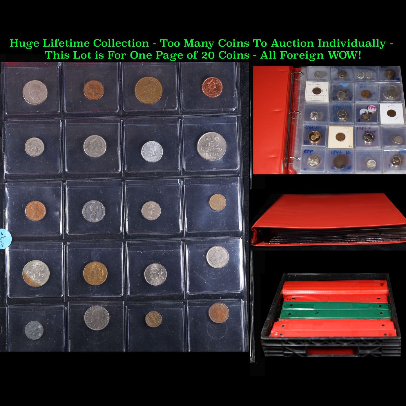 Huge Liifetime Collection - Too Many Coins To Auction Individually - This Lot is For One Page of 20 Foreign Coins. We have received a huge collection of over 10 thousand US coins in flips, 2x2 holders, and 20 coin pages. We are forced, due to limited lots, to sell this collection in pages of 20 coins. All of the pages include Silver Coins. Most contain Indian Cents, Proof Coins, Barber Coinage, Bust Coinage, Lincoln Cents, Flying Eagles, Jefferson Nickels, Roosevelt Dimes, Buffalo Nickels, Eisenhower Dollars, Kennedy Halves, Large Cents including some Draped Bust Large Cents, Mercury Dimes, and Liberty V Nickels. These pages could not be reviewed by anyone in our office due to time constraints. We estimate the value of each page to meet or exceed $200 in value! Good luck and happy hunting.