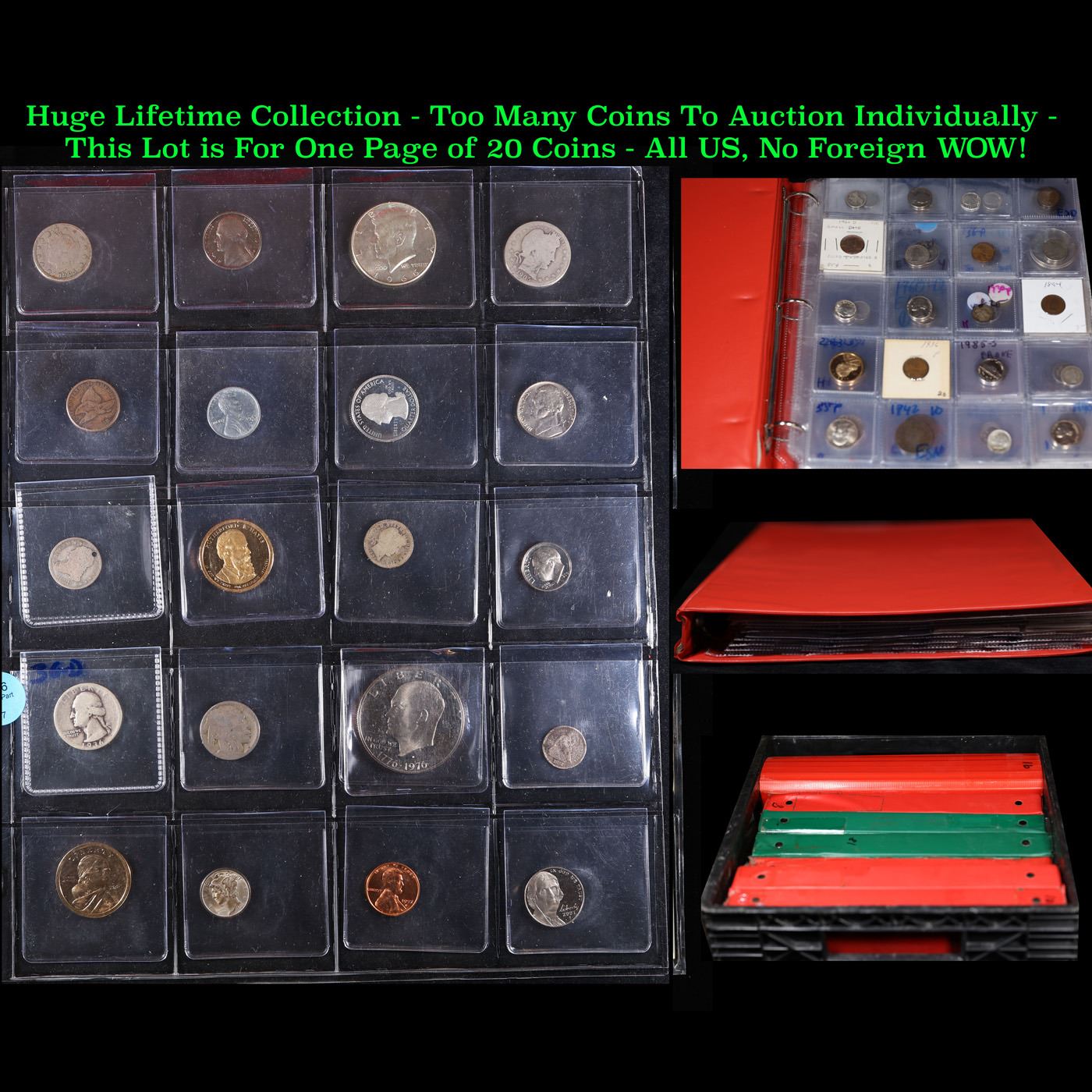 Huge Liifetime Collection - Too Many Coins To Auction Individually - This Lot is For One Page of 20 Coins - All US, No Foreign WOW!. We have received a huge collection of over 10 thousand US coins in flips, 2x2 holders, and 20 coin pages. We are forced, due to limited lots, to sell this collection in pages of 20 coins. All of the pages include Silver Coins. Most contain Indian Cents, Proof Coins, Barber Coinage, Bust Coinage, Lincoln Cents, Flying Eagles, Jefferson Nickels, Roosevelt Dimes, Buffalo Nickels, Eisenhower Dollars, Kennedy Halves, Large Cents including some Draped Bust Large Cents, Mercury Dimes, and Liberty V Nickels. These pages could not be reviewed by anyone in our office due to time constraints. We estimate the value of each page to meet or exceed $200 in value! Good luck and happy hunting.