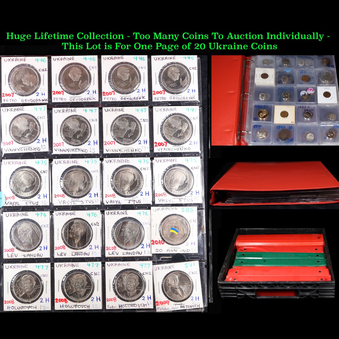 Huge Liifetime Collection - Too Many Coins To Auction Individually - This Lot is For One Page of 20 Ukraine Coins. We have received a huge collection of over 10 thousand US coins in flips, 2x2 holders, and 20 coin pages. We are forced, due to limited lots, to sell this collection in pages of 20 coins. All of the pages include Silver Coins. Most contain Indian Cents, Proof Coins, Barber Coinage, Bust Coinage, Lincoln Cents, Flying Eagles, Jefferson Nickels, Roosevelt Dimes, Buffalo Nickels, Eisenhower Dollars, Kennedy Halves, Large Cents including some Draped Bust Large Cents, Mercury Dimes, and Liberty V Nickels. These pages could not be reviewed by anyone in our office due to time constraints. We estimate the value of each page to meet or exceed $200 in value! Good luck and happy hunting.