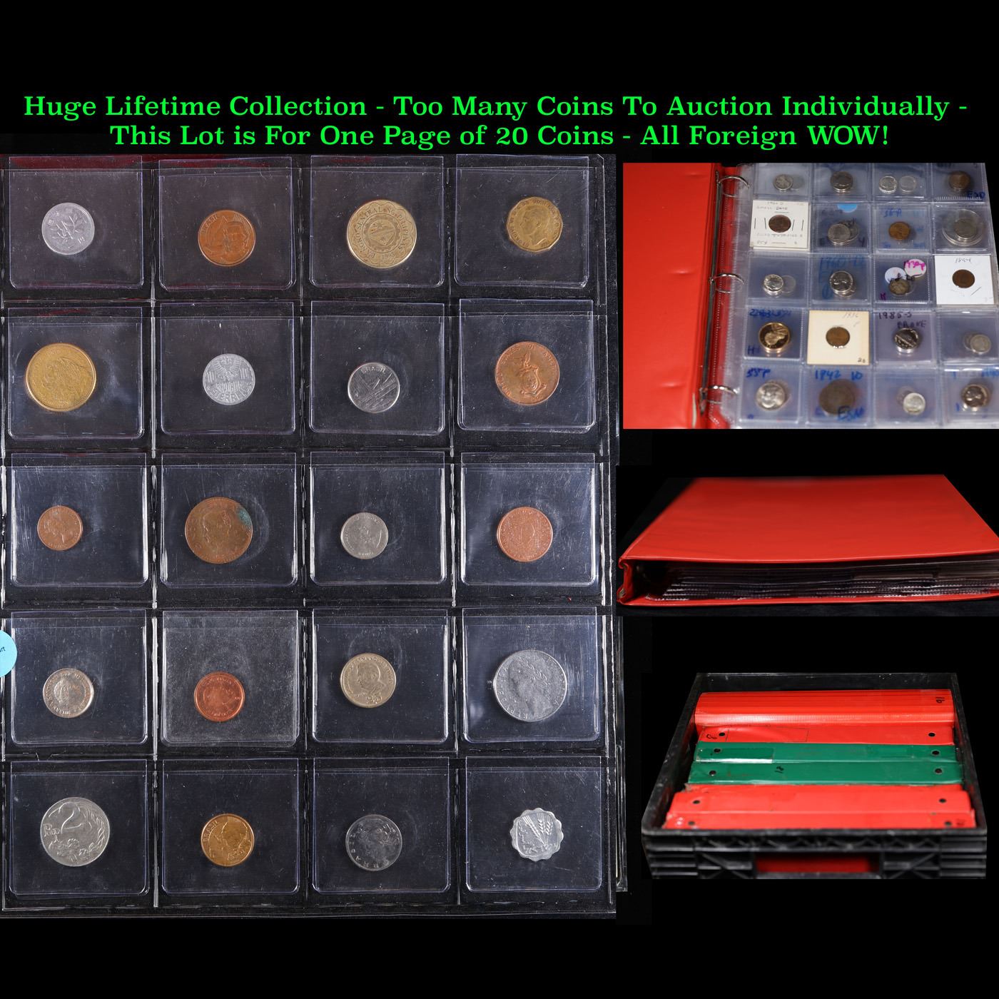 Huge Liifetime Collection - Too Many Coins To Auction Individually - This Lot is For One Page of 20 Foreign Coins. We have received a huge collection of over 10 thousand US coins in flips, 2x2 holders, and 20 coin pages. We are forced, due to limited lots, to sell this collection in pages of 20 coins. All of the pages include Silver Coins. Most contain Indian Cents, Proof Coins, Barber Coinage, Bust Coinage, Lincoln Cents, Flying Eagles, Jefferson Nickels, Roosevelt Dimes, Buffalo Nickels, Eisenhower Dollars, Kennedy Halves, Large Cents including some Draped Bust Large Cents, Mercury Dimes, and Liberty V Nickels. These pages could not be reviewed by anyone in our office due to time constraints. We estimate the value of each page to meet or exceed $200 in value! Good luck and happy hunting.