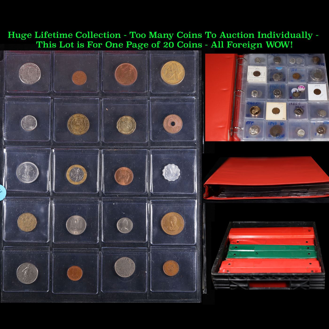 Huge Liifetime Collection - Too Many Coins To Auction Individually - This Lot is For One Page of 20 Foreign Coins. We have received a huge collection of over 10 thousand US coins in flips, 2x2 holders, and 20 coin pages. We are forced, due to limited lots, to sell this collection in pages of 20 coins. All of the pages include Silver Coins. Most contain Indian Cents, Proof Coins, Barber Coinage, Bust Coinage, Lincoln Cents, Flying Eagles, Jefferson Nickels, Roosevelt Dimes, Buffalo Nickels, Eisenhower Dollars, Kennedy Halves, Large Cents including some Draped Bust Large Cents, Mercury Dimes, and Liberty V Nickels. These pages could not be reviewed by anyone in our office due to time constraints. We estimate the value of each page to meet or exceed $200 in value! Good luck and happy hunting.