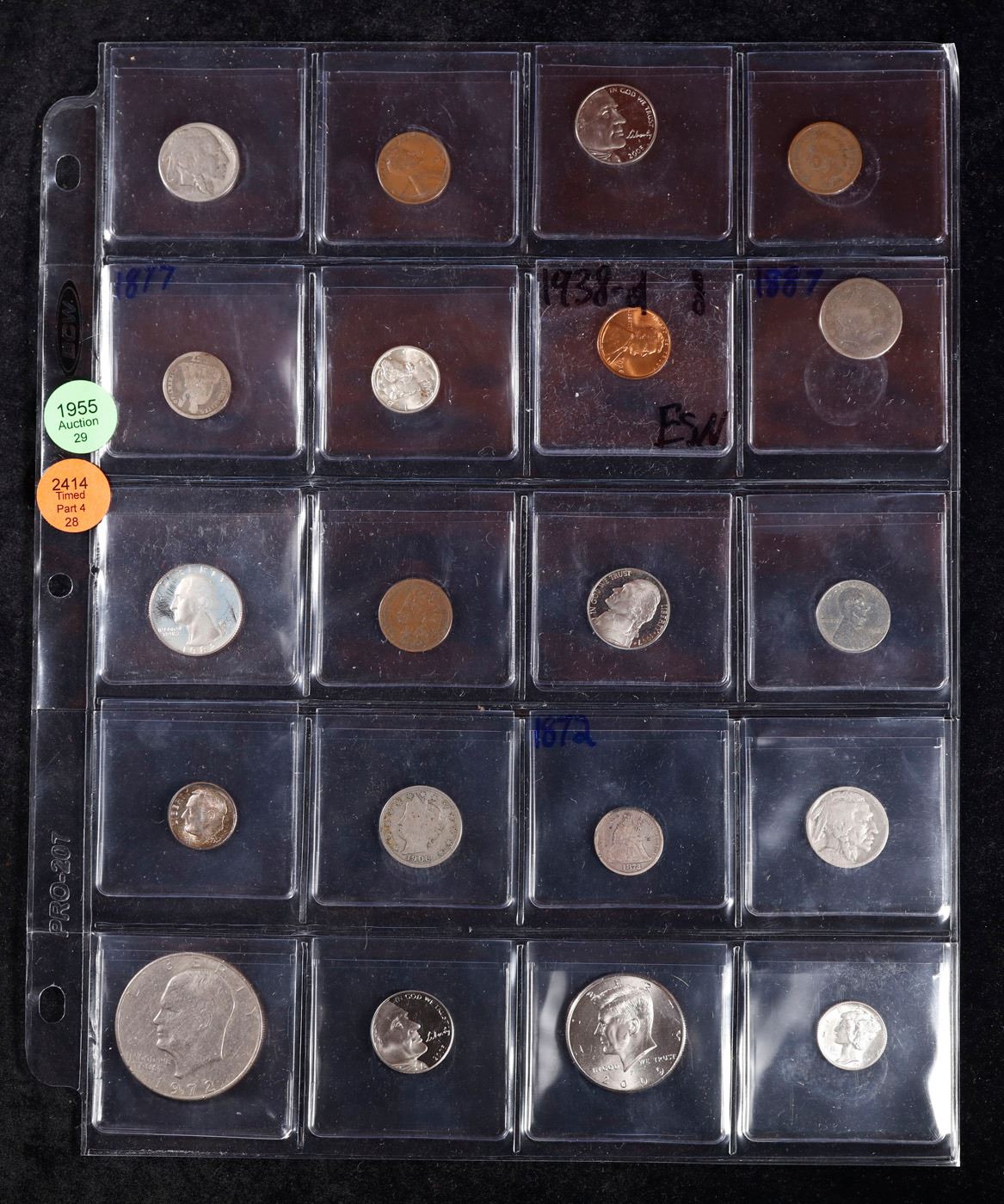 Huge Liifetime Collection - Too Many Coins To Auction Individually - This Lot is For One Page of 20 Coins - All US, No Foreign WOW!. We have received a huge collection of over 10 thousand US coins in flips, 2x2 holders, and 20 coin pages. We are forced, due to limited lots, to sell this collection in pages of 20 coins. All of the pages include Silver Coins. Most contain Indian Cents, Proof Coins, Barber Coinage, Bust Coinage, Lincoln Cents, Flying Eagles, Jefferson Nickels, Roosevelt Dimes, Buffalo Nickels, Eisenhower Dollars, Kennedy Halves, Large Cents including some Draped Bust Large Cents, Mercury Dimes, and Liberty V Nickels. These pages could not be reviewed by anyone in our office due to time constraints. We estimate the value of each page to meet or exceed $200 in value! Good luck and happy hunting.