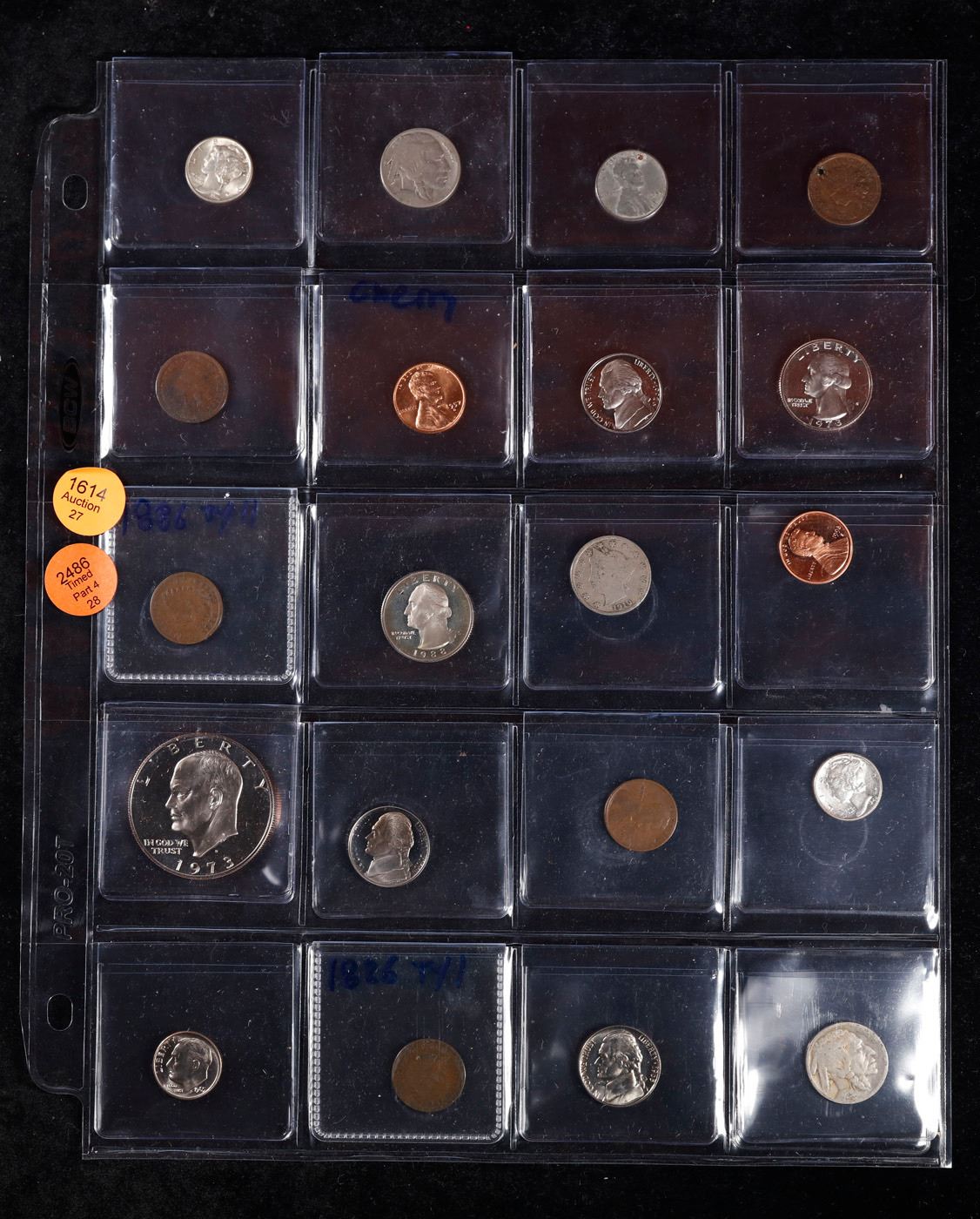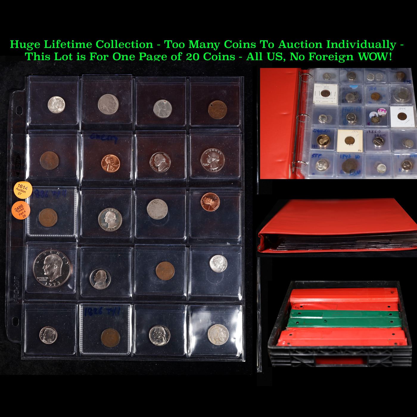 Huge Liifetime Collection - Too Many Coins To Auction Individually - This Lot is For One Page of 20 Coins - All US, No Foreign WOW!. We have received a huge collection of over 10 thousand US coins in flips, 2x2 holders, and 20 coin pages. We are forced, due to limited lots, to sell this collection in pages of 20 coins. All of the pages include Silver Coins. Most contain Indian Cents, Proof Coins, Barber Coinage, Bust Coinage, Lincoln Cents, Flying Eagles, Jefferson Nickels, Roosevelt Dimes, Buffalo Nickels, Eisenhower Dollars, Kennedy Halves, Large Cents including some Draped Bust Large Cents, Mercury Dimes, and Liberty V Nickels. These pages could not be reviewed by anyone in our office due to time constraints. We estimate the value of each page to meet or exceed $200 in value! Good luck and happy hunting.