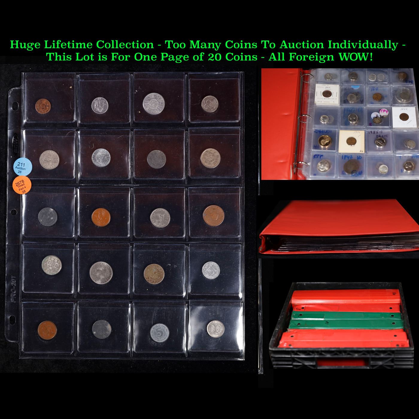 Huge Liifetime Collection - Too Many Coins To Auction Individually - This Lot is For One Page of 20 Foreign Coins. We have received a huge collection of over 10 thousand US coins in flips, 2x2 holders, and 20 coin pages. We are forced, due to limited lots, to sell this collection in pages of 20 coins. All of the pages include Silver Coins. Most contain Indian Cents, Proof Coins, Barber Coinage, Bust Coinage, Lincoln Cents, Flying Eagles, Jefferson Nickels, Roosevelt Dimes, Buffalo Nickels, Eisenhower Dollars, Kennedy Halves, Large Cents including some Draped Bust Large Cents, Mercury Dimes, and Liberty V Nickels. These pages could not be reviewed by anyone in our office due to time constraints. We estimate the value of each page to meet or exceed $200 in value! Good luck and happy hunting.