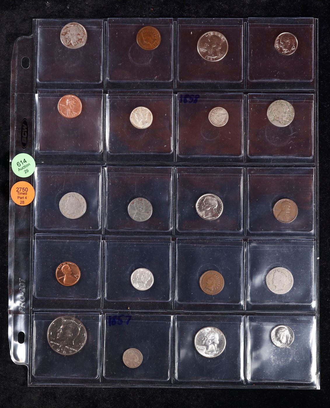 Huge Liifetime Collection - Too Many Coins To Auction Individually - This Lot is For One Page of 20 Coins - All US, No Foreign WOW!. We have received a huge collection of over 10 thousand US coins in flips, 2x2 holders, and 20 coin pages. We are forced, due to limited lots, to sell this collection in pages of 20 coins. All of the pages include Silver Coins. Most contain Indian Cents, Proof Coins, Barber Coinage, Bust Coinage, Lincoln Cents, Flying Eagles, Jefferson Nickels, Roosevelt Dimes, Buffalo Nickels, Eisenhower Dollars, Kennedy Halves, Large Cents including some Draped Bust Large Cents, Mercury Dimes, and Liberty V Nickels. These pages could not be reviewed by anyone in our office due to time constraints. We estimate the value of each page to meet or exceed $200 in value! Good luck and happy hunting.