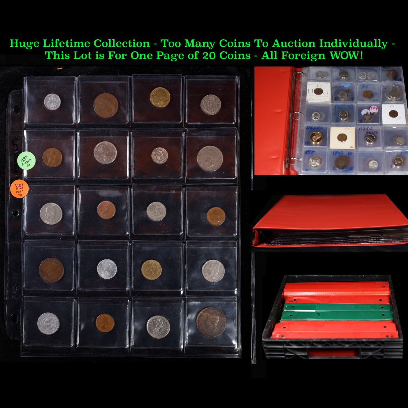 Huge Liifetime Collection - Too Many Coins To Auction Individually - This Lot is For One Page of 20 Foreign Coins. We have received a huge collection of over 10 thousand US coins in flips, 2x2 holders, and 20 coin pages. We are forced, due to limited lots, to sell this collection in pages of 20 coins. All of the pages include Silver Coins. Most contain Indian Cents, Proof Coins, Barber Coinage, Bust Coinage, Lincoln Cents, Flying Eagles, Jefferson Nickels, Roosevelt Dimes, Buffalo Nickels, Eisenhower Dollars, Kennedy Halves, Large Cents including some Draped Bust Large Cents, Mercury Dimes, and Liberty V Nickels. These pages could not be reviewed by anyone in our office due to time constraints. We estimate the value of each page to meet or exceed $200 in value! Good luck and happy hunting.