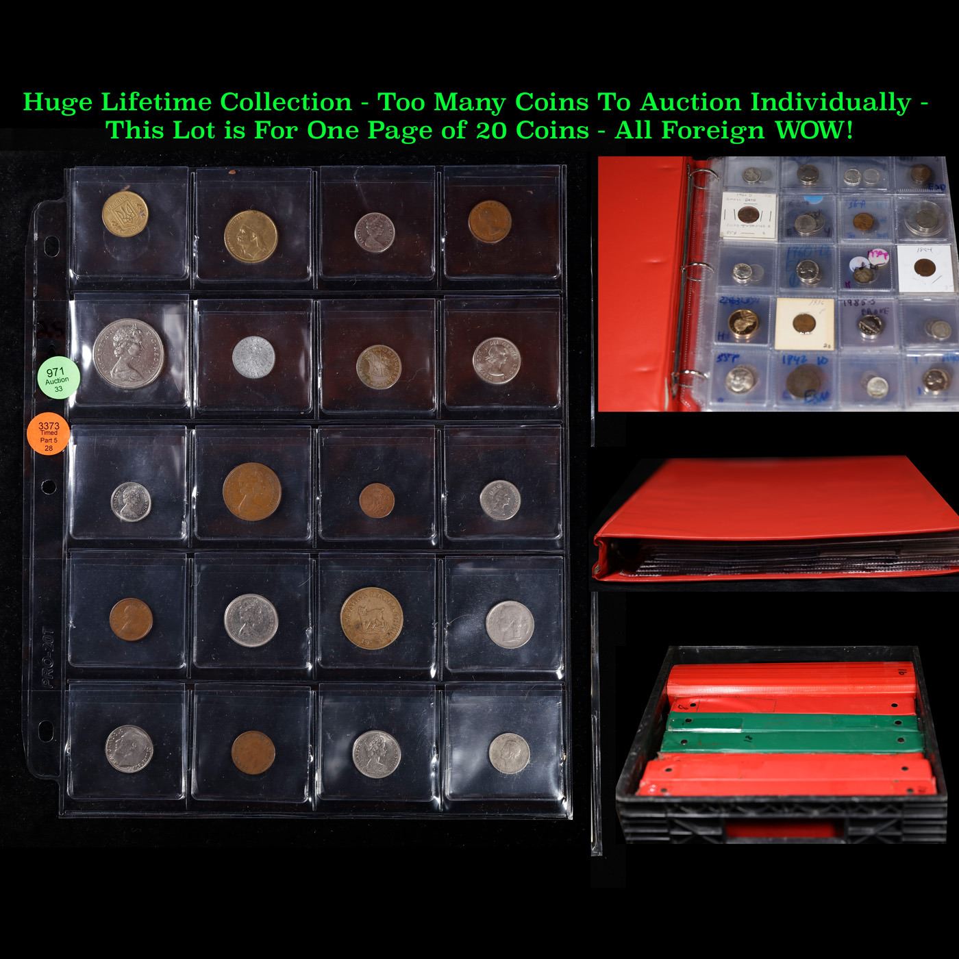Huge Liifetime Collection - Too Many Coins To Auction Individually - This Lot is For One Page of 20 Foreign Coins. We have received a huge collection of over 10 thousand US coins in flips, 2x2 holders, and 20 coin pages. We are forced, due to limited lots, to sell this collection in pages of 20 coins. All of the pages include Silver Coins. Most contain Indian Cents, Proof Coins, Barber Coinage, Bust Coinage, Lincoln Cents, Flying Eagles, Jefferson Nickels, Roosevelt Dimes, Buffalo Nickels, Eisenhower Dollars, Kennedy Halves, Large Cents including some Draped Bust Large Cents, Mercury Dimes, and Liberty V Nickels. These pages could not be reviewed by anyone in our office due to time constraints. We estimate the value of each page to meet or exceed $200 in value! Good luck and happy hunting.