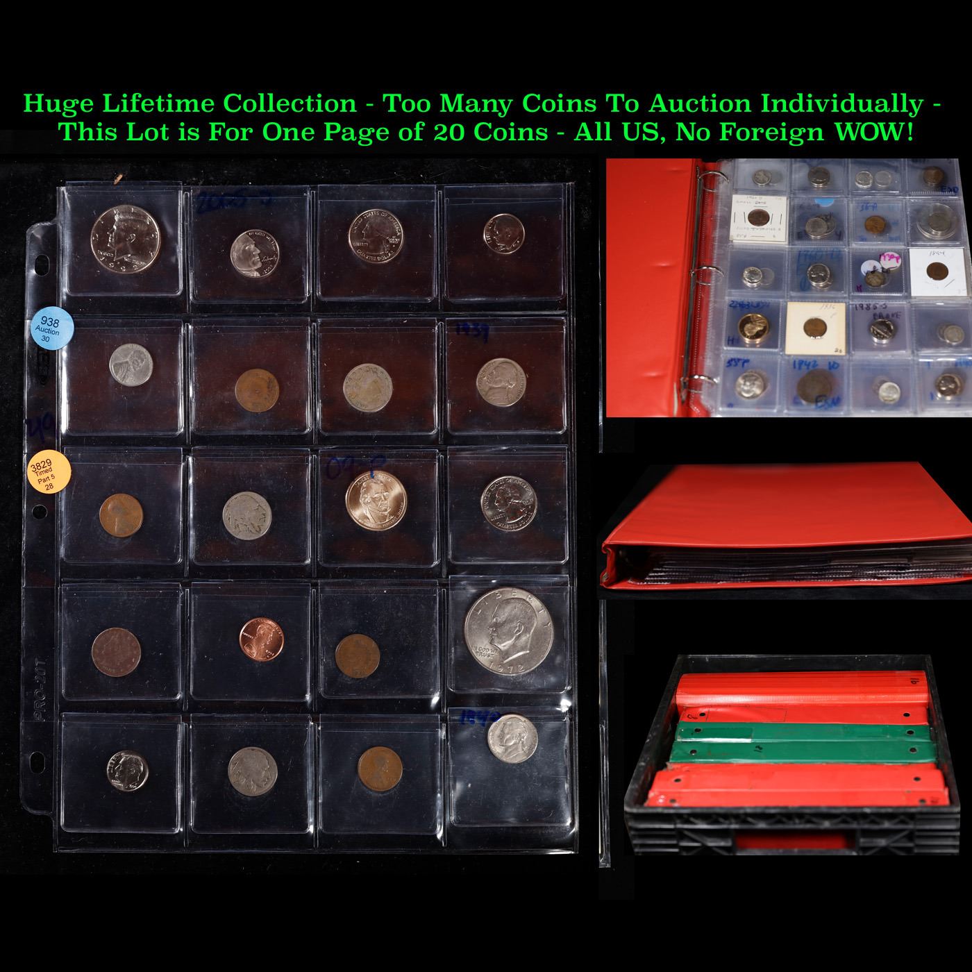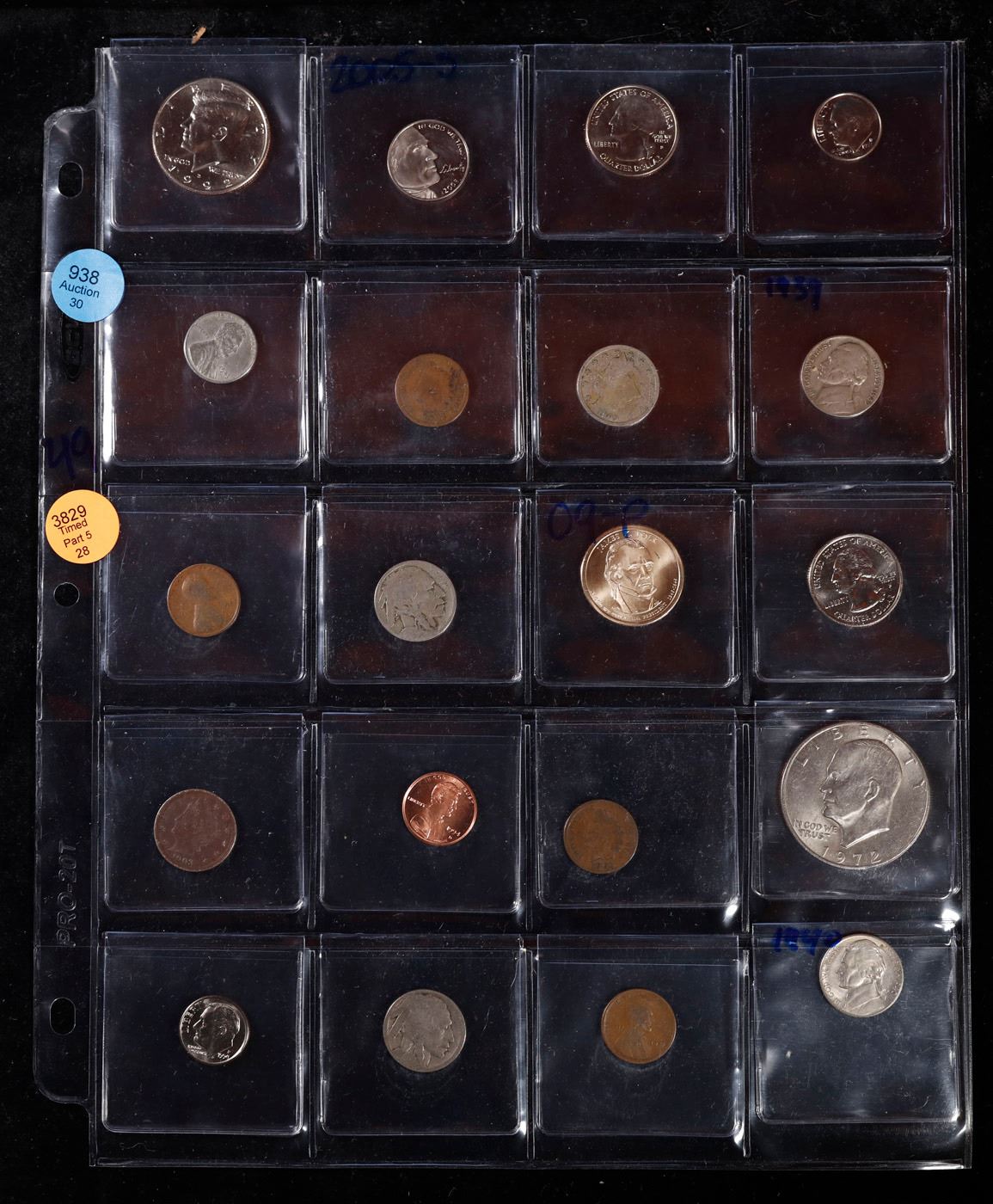 Huge Liifetime Collection - Too Many Coins To Auction Individually - This Lot is For One Page of 20 Coins - All US, No Foreign WOW!. We have received a huge collection of over 10 thousand US coins in flips, 2x2 holders, and 20 coin pages. We are forced, due to limited lots, to sell this collection in pages of 20 coins. All of the pages include Silver Coins. Most contain Indian Cents, Proof Coins, Barber Coinage, Bust Coinage, Lincoln Cents, Flying Eagles, Jefferson Nickels, Roosevelt Dimes, Buffalo Nickels, Eisenhower Dollars, Kennedy Halves, Large Cents including some Draped Bust Large Cents, Mercury Dimes, and Liberty V Nickels. These pages could not be reviewed by anyone in our office due to time constraints. We estimate the value of each page to meet or exceed $200 in value! Good luck and happy hunting.