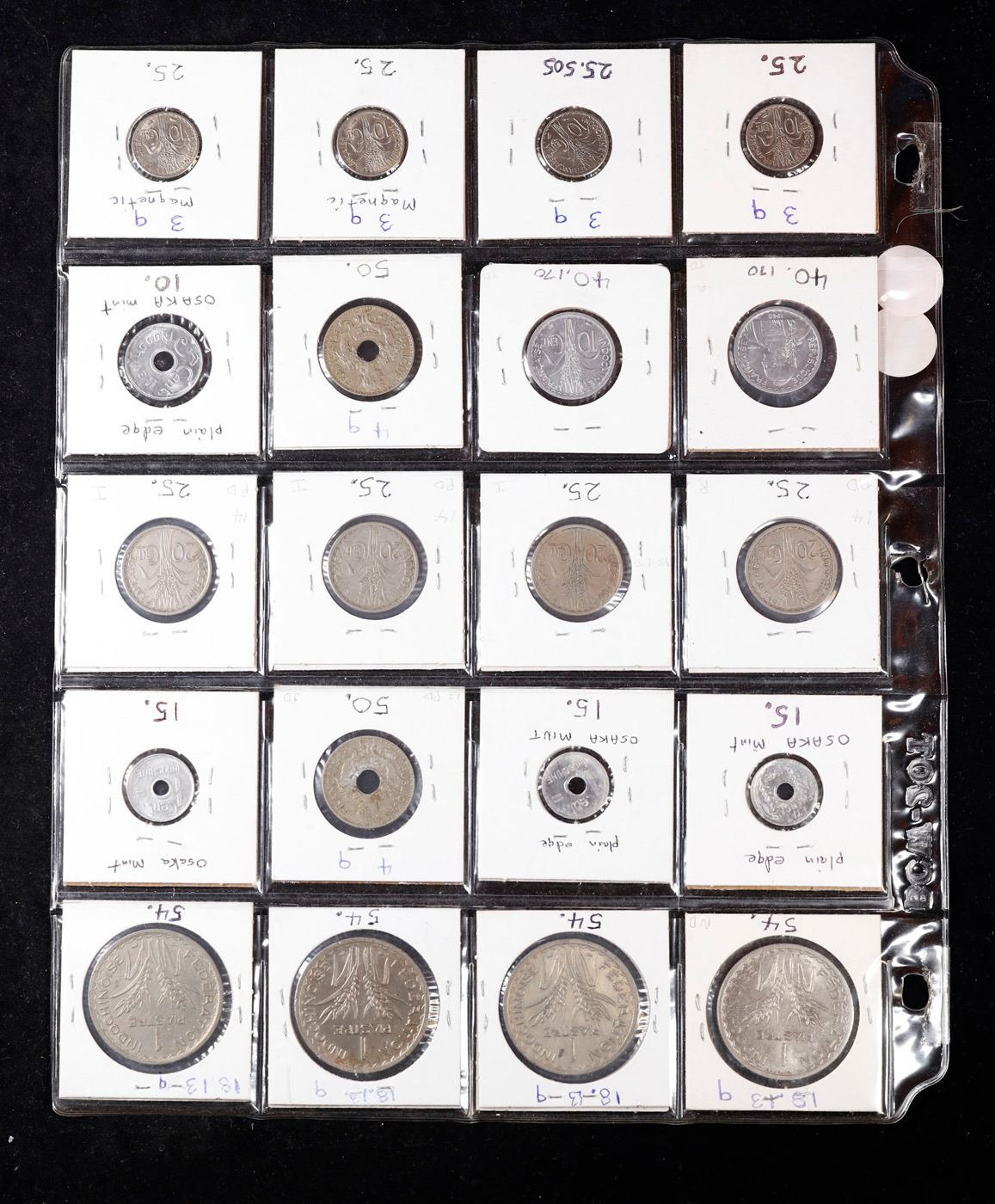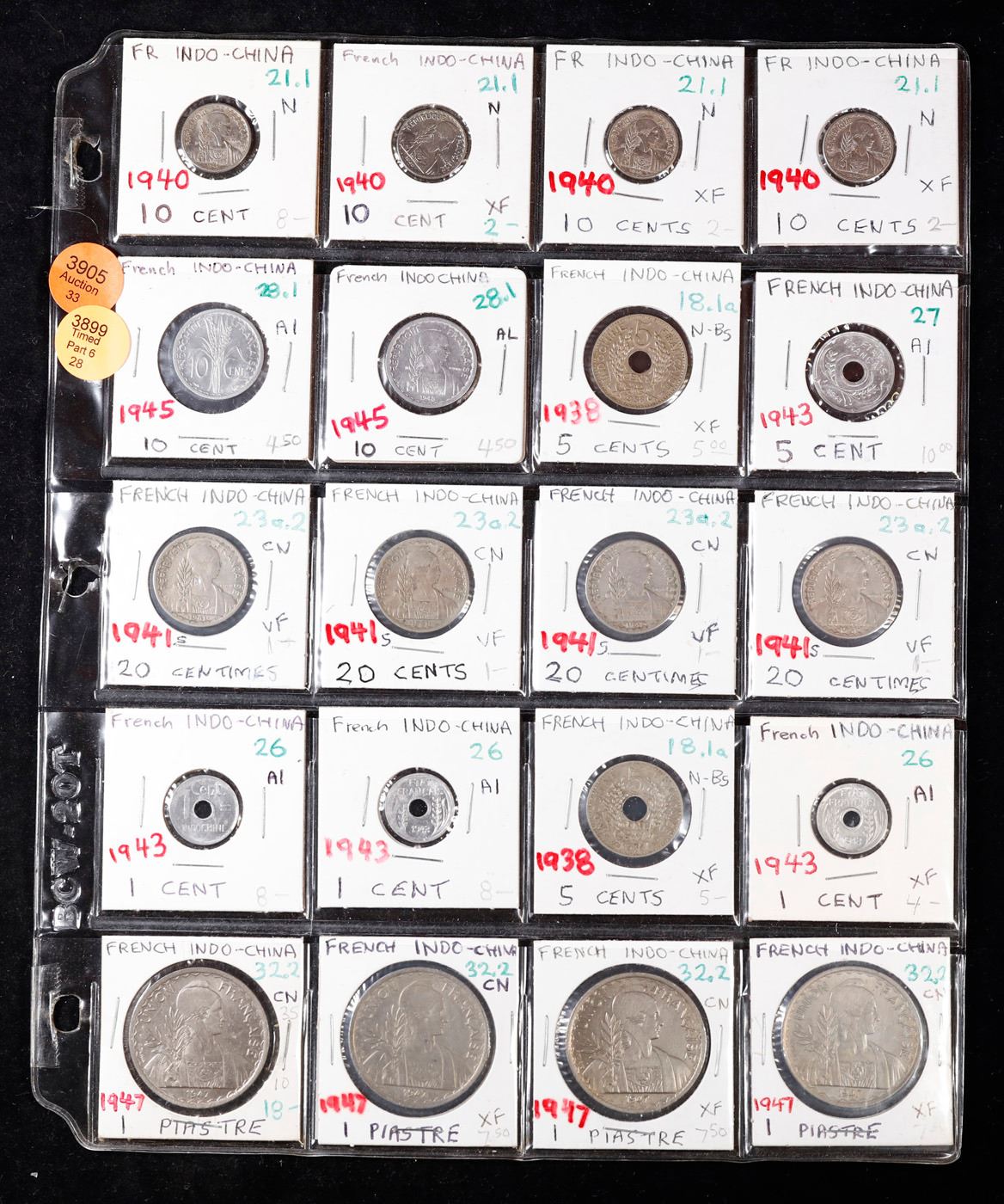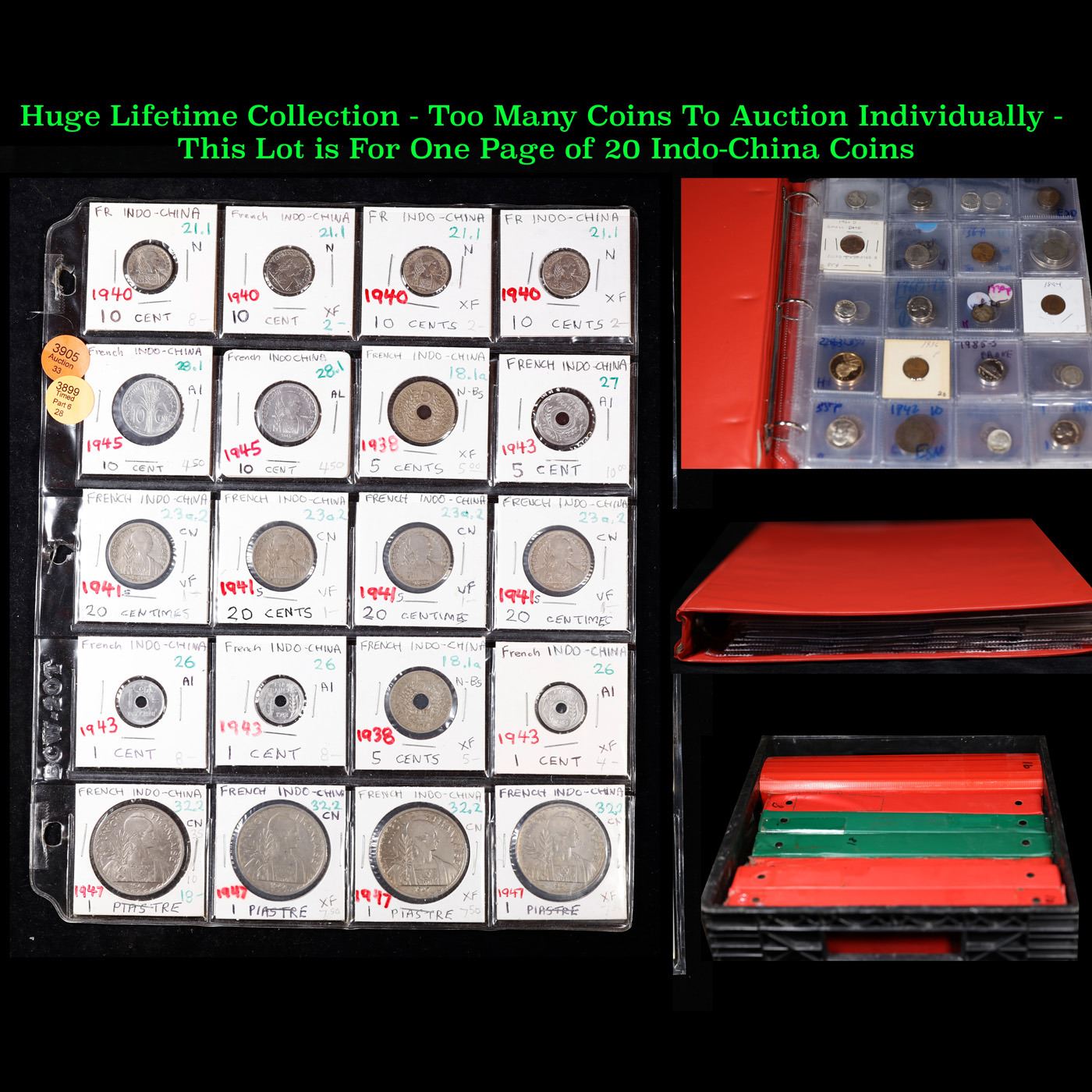 Huge Liifetime Collection - Too Many Coins To Auction Individually - This Lot is For One Page of 20 French Indo China Coins. We have received a huge collection of over 10 thousand US coins in flips, 2x2 holders, and 20 coin pages. We are forced, due to limited lots, to sell this collection in pages of 20 coins. All of the pages include Silver Coins. Most contain Indian Cents, Proof Coins, Barber Coinage, Bust Coinage, Lincoln Cents, Flying Eagles, Jefferson Nickels, Roosevelt Dimes, Buffalo Nickels, Eisenhower Dollars, Kennedy Halves, Large Cents including some Draped Bust Large Cents, Mercury Dimes, and Liberty V Nickels. These pages could not be reviewed by anyone in our office due to time constraints. We estimate the value of each page to meet or exceed $200 in value! Good luck and happy hunting.