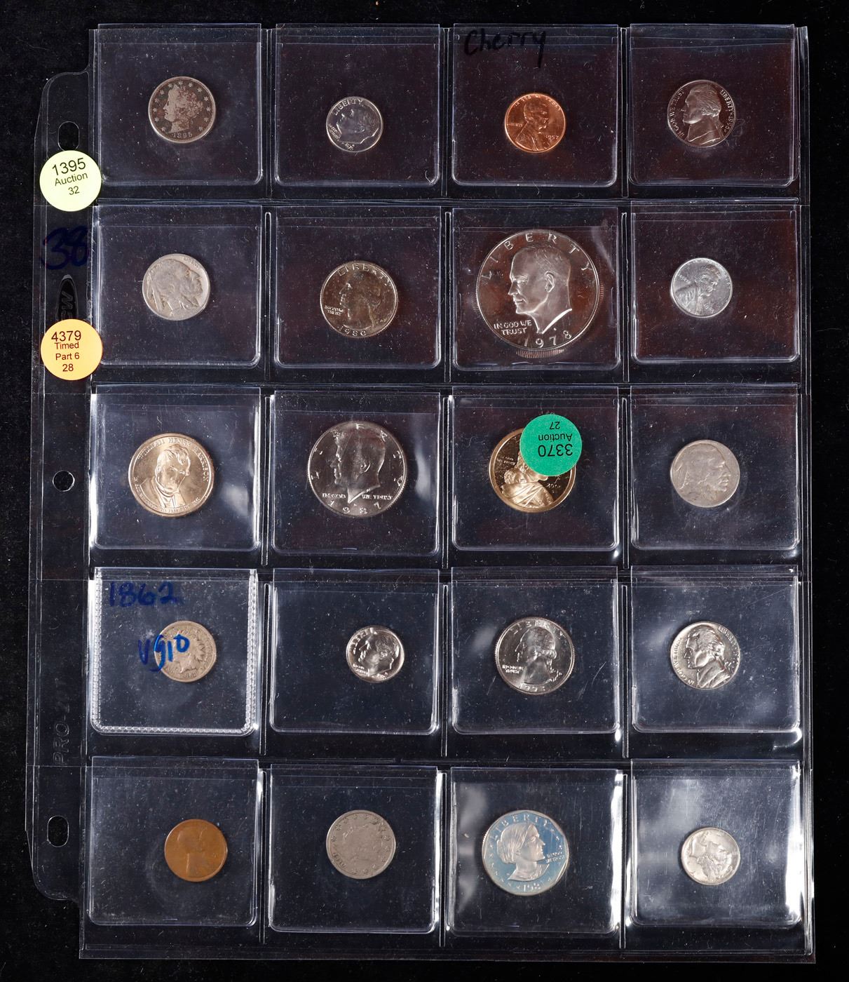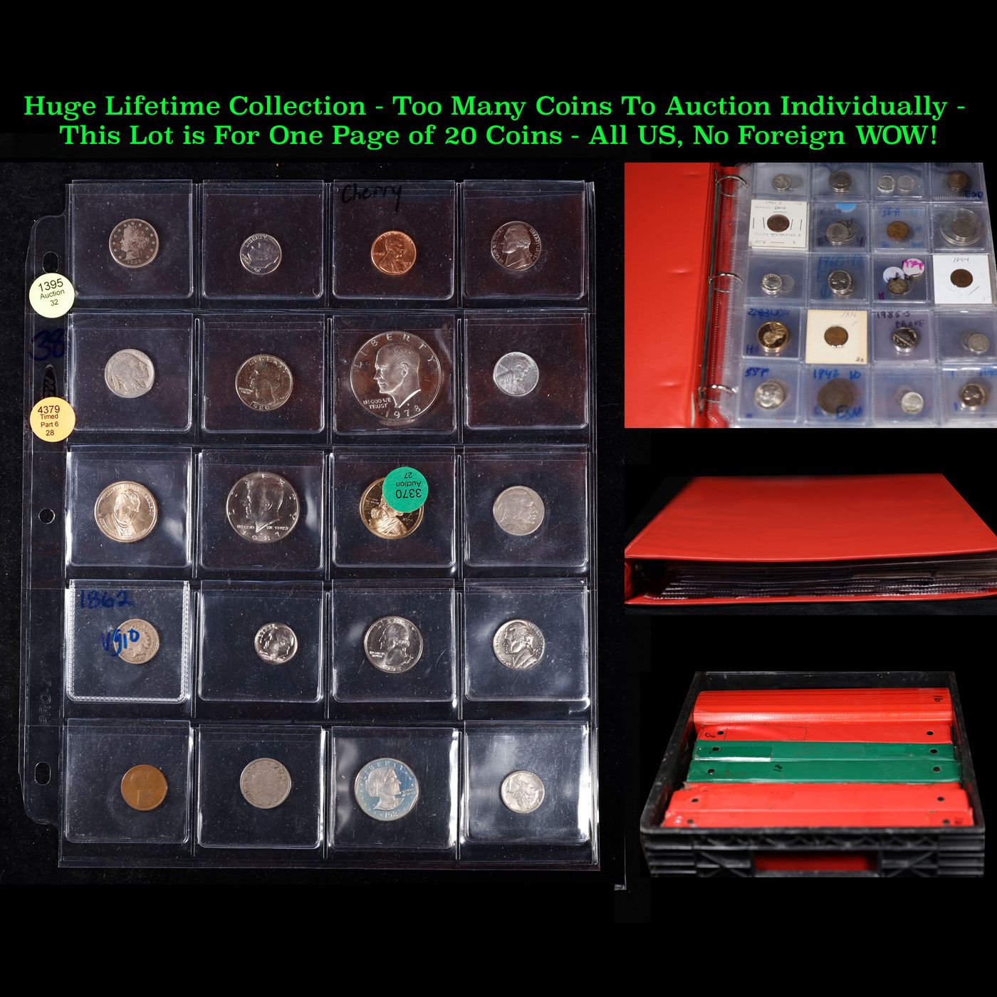 Huge Liifetime Collection - Too Many Coins To Auction Individually - This Lot is For One Page of 20 Coins - All US, No Foreign WOW!. We have received a huge collection of over 10 thousand US coins in flips, 2x2 holders, and 20 coin pages. We are forced, due to limited lots, to sell this collection in pages of 20 coins. All of the pages include Silver Coins. Most contain Indian Cents, Proof Coins, Barber Coinage, Bust Coinage, Lincoln Cents, Flying Eagles, Jefferson Nickels, Roosevelt Dimes, Buffalo Nickels, Eisenhower Dollars, Kennedy Halves, Large Cents including some Draped Bust Large Cents, Mercury Dimes, and Liberty V Nickels. These pages could not be reviewed by anyone in our office due to time constraints. We estimate the value of each page to meet or exceed $200 in value! Good luck and happy hunting.