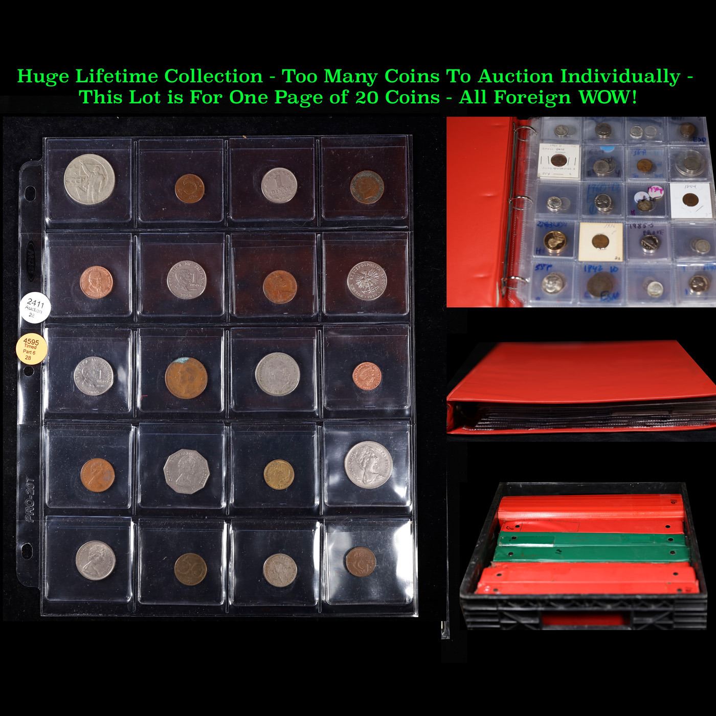 Huge Liifetime Collection - Too Many Coins To Auction Individually - This Lot is For One Page of 20 Foreign Coins. We have received a huge collection of over 10 thousand US coins in flips, 2x2 holders, and 20 coin pages. We are forced, due to limited lots, to sell this collection in pages of 20 coins. All of the pages include Silver Coins. Most contain Indian Cents, Proof Coins, Barber Coinage, Bust Coinage, Lincoln Cents, Flying Eagles, Jefferson Nickels, Roosevelt Dimes, Buffalo Nickels, Eisenhower Dollars, Kennedy Halves, Large Cents including some Draped Bust Large Cents, Mercury Dimes, and Liberty V Nickels. These pages could not be reviewed by anyone in our office due to time constraints. We estimate the value of each page to meet or exceed $200 in value! Good luck and happy hunting.