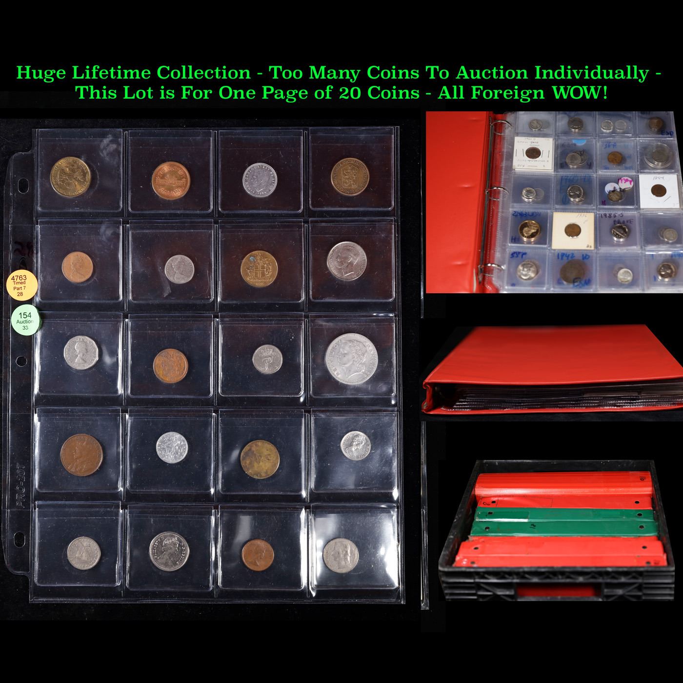 Huge Liifetime Collection - Too Many Coins To Auction Individually - This Lot is For One Page of 20 Foreign Coins. We have received a huge collection of over 10 thousand US coins in flips, 2x2 holders, and 20 coin pages. We are forced, due to limited lots, to sell this collection in pages of 20 coins. All of the pages include Silver Coins. Most contain Indian Cents, Proof Coins, Barber Coinage, Bust Coinage, Lincoln Cents, Flying Eagles, Jefferson Nickels, Roosevelt Dimes, Buffalo Nickels, Eisenhower Dollars, Kennedy Halves, Large Cents including some Draped Bust Large Cents, Mercury Dimes, and Liberty V Nickels. These pages could not be reviewed by anyone in our office due to time constraints. We estimate the value of each page to meet or exceed $200 in value! Good luck and happy hunting.