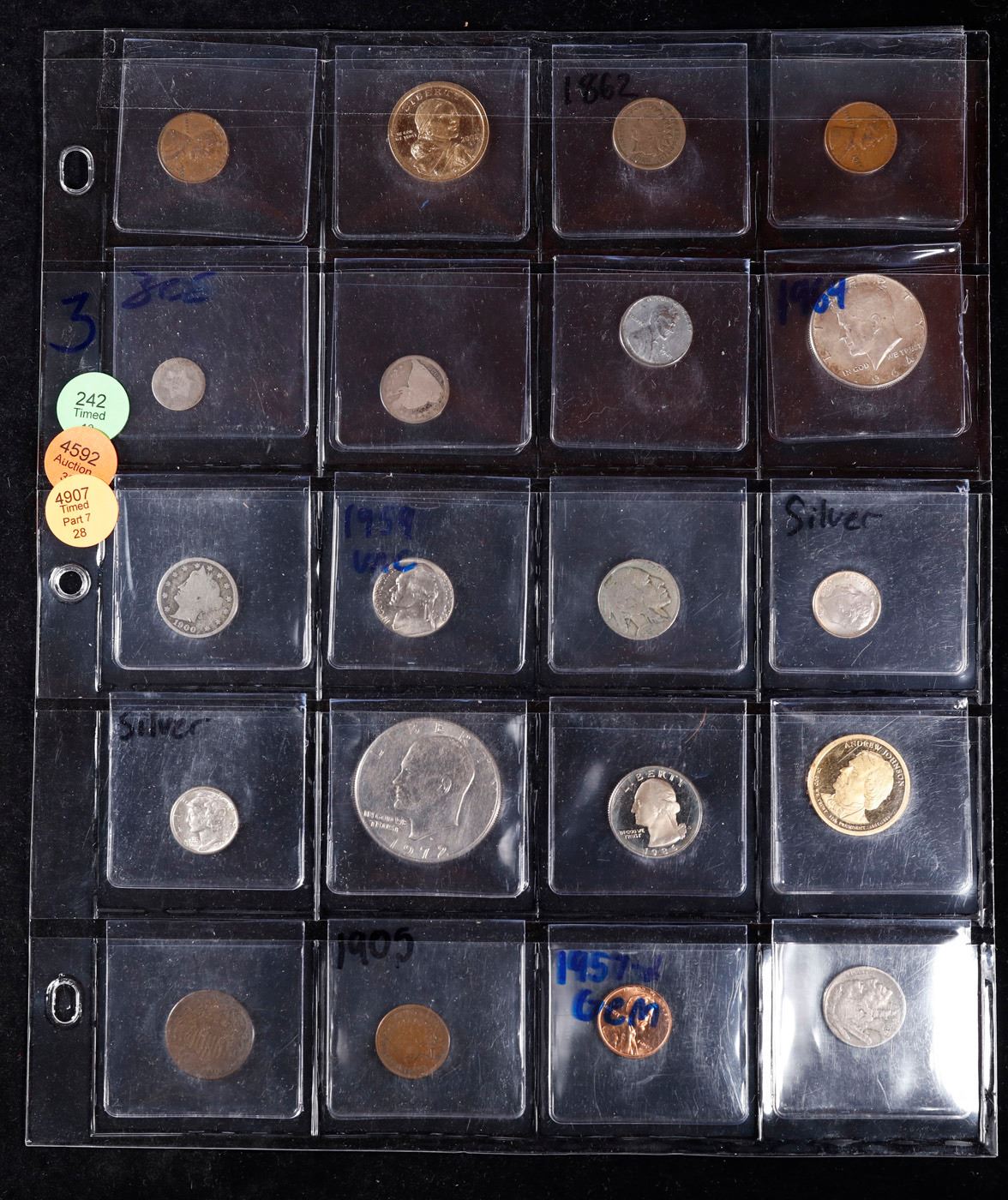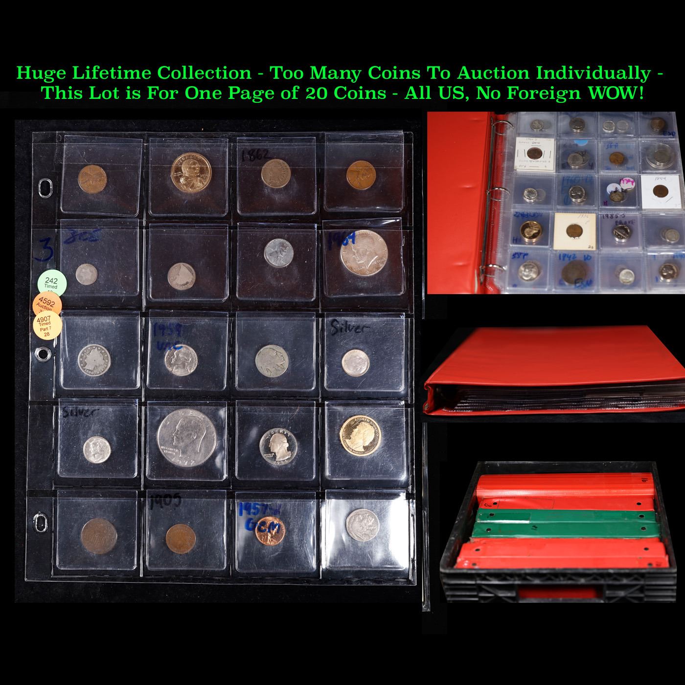 Huge Liifetime Collection - Too Many Coins To Auction Individually - This Lot is For One Page of 20 Coins - All US, No Foreign WOW!. We have received a huge collection of over 10 thousand US coins in flips, 2x2 holders, and 20 coin pages. We are forced, due to limited lots, to sell this collection in pages of 20 coins. All of the pages include Silver Coins. Most contain Indian Cents, Proof Coins, Barber Coinage, Bust Coinage, Lincoln Cents, Flying Eagles, Jefferson Nickels, Roosevelt Dimes, Buffalo Nickels, Eisenhower Dollars, Kennedy Halves, Large Cents including some Draped Bust Large Cents, Mercury Dimes, and Liberty V Nickels. These pages could not be reviewed by anyone in our office due to time constraints. We estimate the value of each page to meet or exceed $200 in value! Good luck and happy hunting.