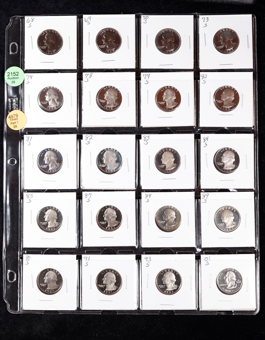 Huge Liifetime Collection - Too Many Coins To Auction Individually - This Lot is For One Page of 20 Proof Washington Quarters Dates Range From 1982-2006. This Lot is For One Page of 20 Proof Washington Quarters Dates Range From 1982-2006. We have received a huge collection of over 10 thousand US coins in flips, 2x2 holders, and 20 coin pages. We are forced, due to limited lots, to sell this collection in pages of 20 coins. This Page is For 20 Proof Washington Quarters Trends 2002-s pr69 DCAM $19 1994-s pr69 DCAM $16, 1982-s pr69 DCAM $15, 2002-s pr69 DCAM $19, 2006-s pr69 DCAM $19, 2003-s pr69 DCAM $19, 2003-s pr69 DCAM $19, 2002-s pr69 DCAM $19, 1993-s pr69 DCAM $16, 1982-s pr69 DCAM $15, 1991-s pr69 DCAM $16, 1982-s pr69 DCAM $15, 1990-s pr69 DCAM $16, 1983-s pr69 DCAM $16, 1985-s pr69 DCAM $16, 1987-s pr69 DCAM $16, 1996-s pr69 DCAM $16, 1993-s pr69 DCAM $16, 1983-s pr69 DCAM $16, 1984-s pr69 DCAM $16. We estimate the value of each page to meet or exceed $200 in value! Good luck and happy hunting.
