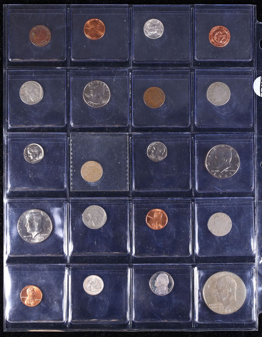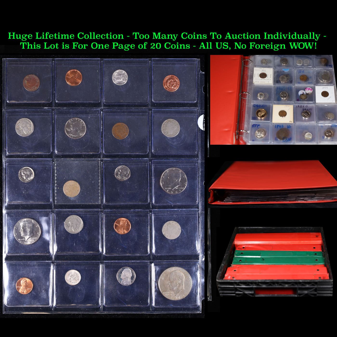 Huge Liifetime Collection - Too Many Coins To Auction Individually - This Lot is For One Page of 20 Coins - All US, No Foreign WOW!. We have received a huge collection of over 10 thousand US coins in flips, 2x2 holders, and 20 coin pages. We are forced, due to limited lots, to sell this collection in pages of 20 coins. All of the pages include Silver Coins. Most contain Indian Cents, Proof Coins, Barber Coinage, Bust Coinage, Lincoln Cents, Flying Eagles, Jefferson Nickels, Roosevelt Dimes, Buffalo Nickels, Eisenhower Dollars, Kennedy Halves, Large Cents including some Draped Bust Large Cents, Mercury Dimes, and Liberty V Nickels. These pages could not be reviewed by anyone in our office due to time constraints. We estimate the value of each page to meet or exceed $200 in value! Good luck and happy hunting.