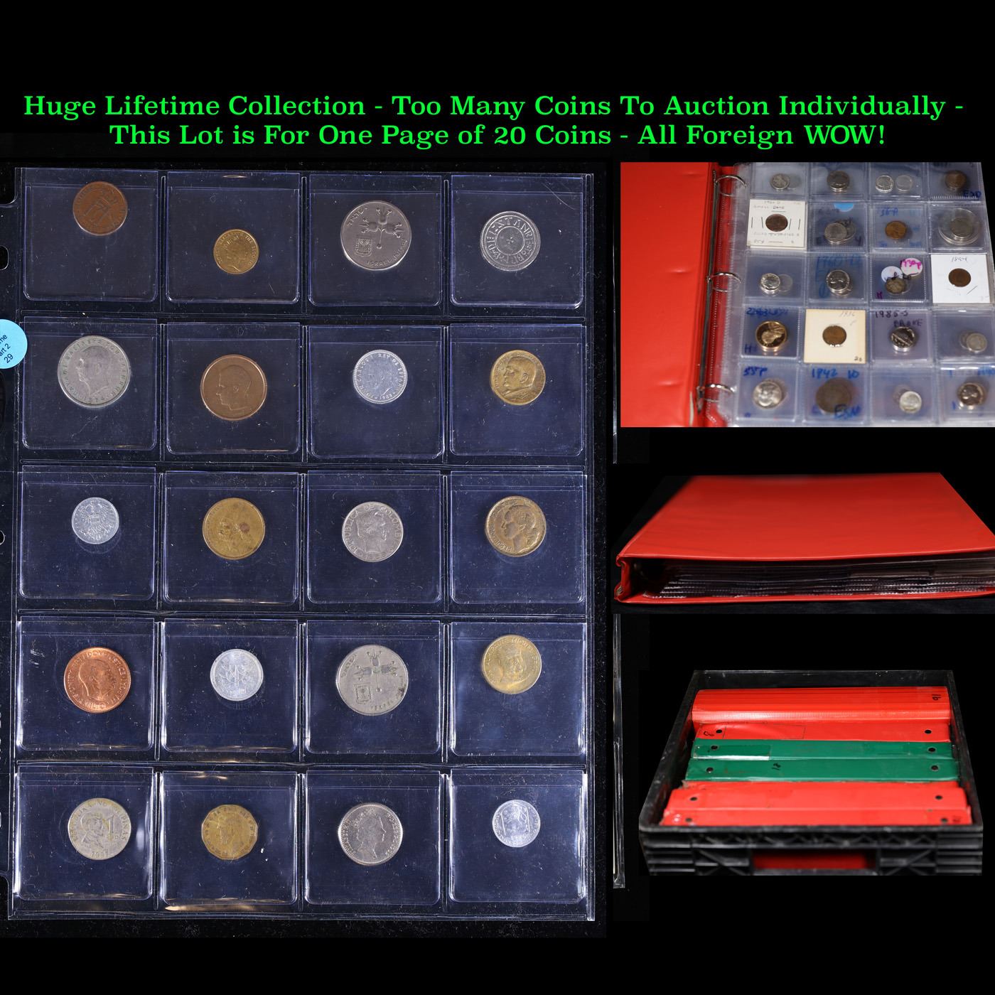 Huge Liifetime Collection - Too Many Coins To Auction Individually - This Lot is For One Page of 20 Foreign Coins. We have received a huge collection of over 10 thousand US coins in flips, 2x2 holders, and 20 coin pages. We are forced, due to limited lots, to sell this collection in pages of 20 coins. All of the pages include Silver Coins. Most contain Indian Cents, Proof Coins, Barber Coinage, Bust Coinage, Lincoln Cents, Flying Eagles, Jefferson Nickels, Roosevelt Dimes, Buffalo Nickels, Eisenhower Dollars, Kennedy Halves, Large Cents including some Draped Bust Large Cents, Mercury Dimes, and Liberty V Nickels. These pages could not be reviewed by anyone in our office due to time constraints. We estimate the value of each page to meet or exceed $200 in value! Good luck and happy hunting.