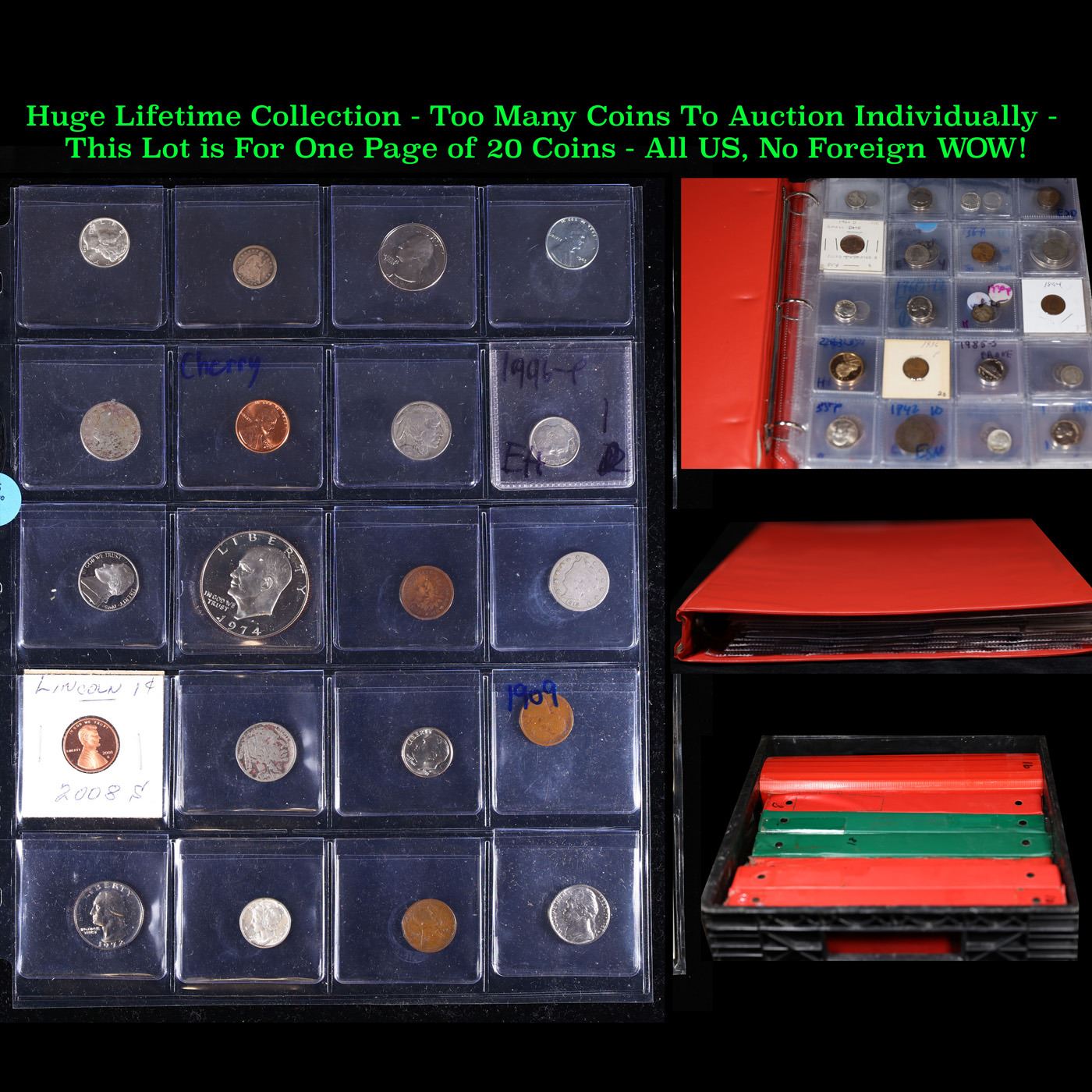 Huge Liifetime Collection - Too Many Coins To Auction Individually - This Lot is For One Page of 20 Coins - All US, No Foreign WOW!. We have received a huge collection of over 10 thousand US coins in flips, 2x2 holders, and 20 coin pages. We are forced, due to limited lots, to sell this collection in pages of 20 coins. All of the pages include Silver Coins. Most contain Indian Cents, Proof Coins, Barber Coinage, Bust Coinage, Lincoln Cents, Flying Eagles, Jefferson Nickels, Roosevelt Dimes, Buffalo Nickels, Eisenhower Dollars, Kennedy Halves, Large Cents including some Draped Bust Large Cents, Mercury Dimes, and Liberty V Nickels. These pages could not be reviewed by anyone in our office due to time constraints. We estimate the value of each page to meet or exceed $200 in value! Good luck and happy hunting.