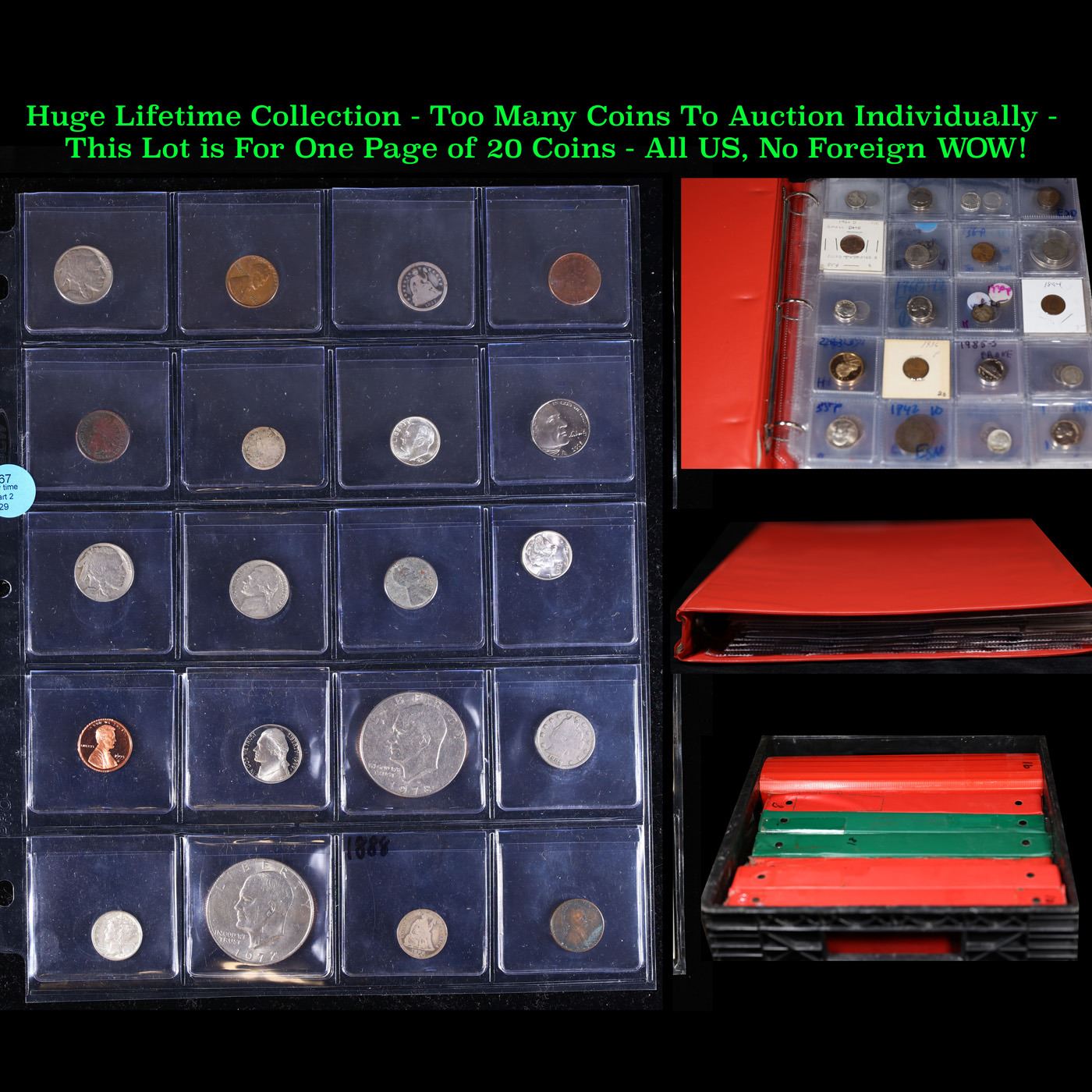 Huge Liifetime Collection - Too Many Coins To Auction Individually - This Lot is For One Page of 20 Coins - All US, No Foreign WOW!. We have received a huge collection of over 10 thousand US coins in flips, 2x2 holders, and 20 coin pages. We are forced, due to limited lots, to sell this collection in pages of 20 coins. All of the pages include Silver Coins. Most contain Indian Cents, Proof Coins, Barber Coinage, Bust Coinage, Lincoln Cents, Flying Eagles, Jefferson Nickels, Roosevelt Dimes, Buffalo Nickels, Eisenhower Dollars, Kennedy Halves, Large Cents including some Draped Bust Large Cents, Mercury Dimes, and Liberty V Nickels. These pages could not be reviewed by anyone in our office due to time constraints. We estimate the value of each page to meet or exceed $200 in value! Good luck and happy hunting.
