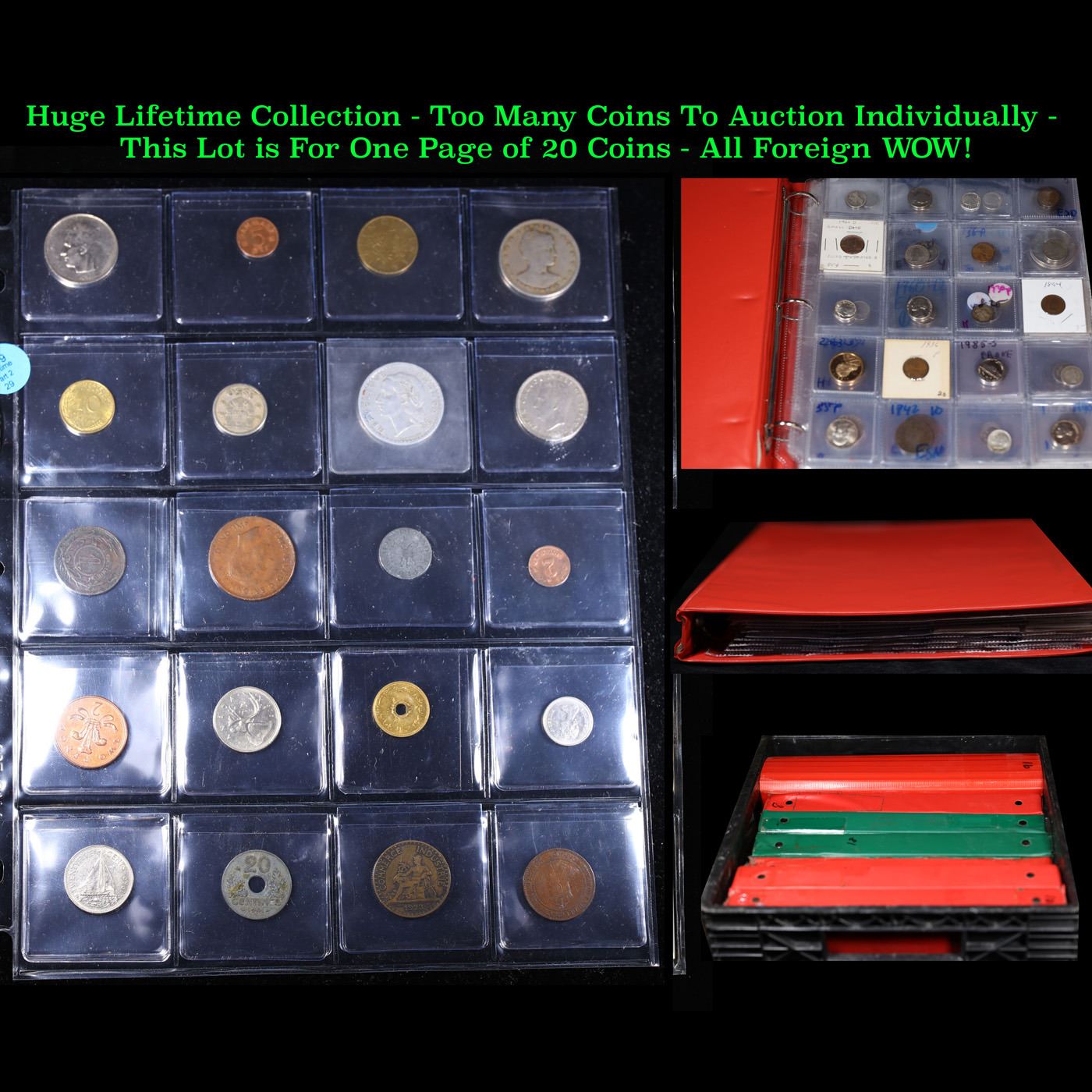 Huge Liifetime Collection - Too Many Coins To Auction Individually - This Lot is For One Page of 20 Foreign Coins. We have received a huge collection of over 10 thousand US coins in flips, 2x2 holders, and 20 coin pages. We are forced, due to limited lots, to sell this collection in pages of 20 coins. All of the pages include Silver Coins. Most contain Indian Cents, Proof Coins, Barber Coinage, Bust Coinage, Lincoln Cents, Flying Eagles, Jefferson Nickels, Roosevelt Dimes, Buffalo Nickels, Eisenhower Dollars, Kennedy Halves, Large Cents including some Draped Bust Large Cents, Mercury Dimes, and Liberty V Nickels. These pages could not be reviewed by anyone in our office due to time constraints. We estimate the value of each page to meet or exceed $200 in value! Good luck and happy hunting.