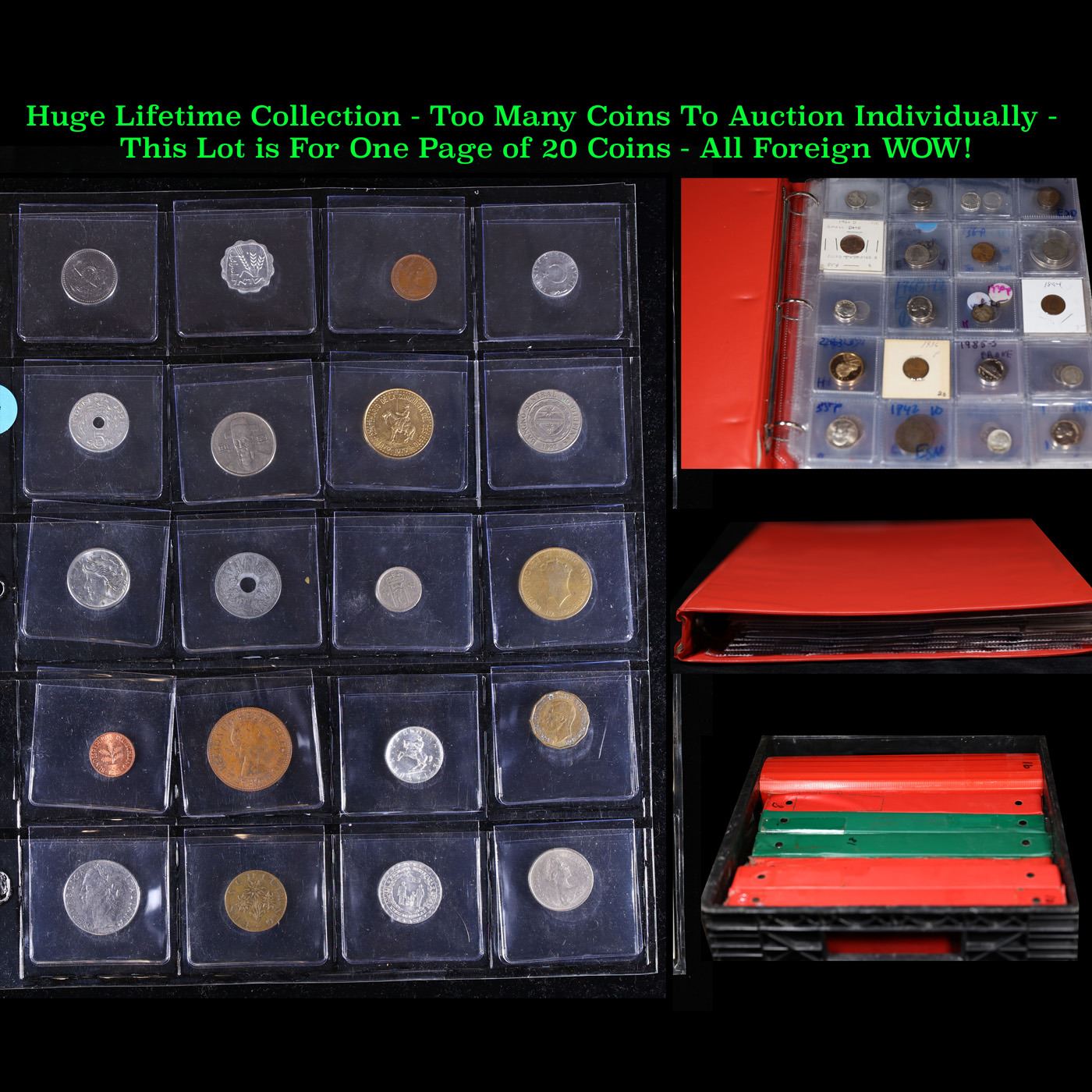 Huge Liifetime Collection - Too Many Coins To Auction Individually - This Lot is For One Page of 20 Foreign Coins. We have received a huge collection of over 10 thousand US coins in flips, 2x2 holders, and 20 coin pages. We are forced, due to limited lots, to sell this collection in pages of 20 coins. All of the pages include Silver Coins. Most contain Indian Cents, Proof Coins, Barber Coinage, Bust Coinage, Lincoln Cents, Flying Eagles, Jefferson Nickels, Roosevelt Dimes, Buffalo Nickels, Eisenhower Dollars, Kennedy Halves, Large Cents including some Draped Bust Large Cents, Mercury Dimes, and Liberty V Nickels. These pages could not be reviewed by anyone in our office due to time constraints. We estimate the value of each page to meet or exceed $200 in value! Good luck and happy hunting.