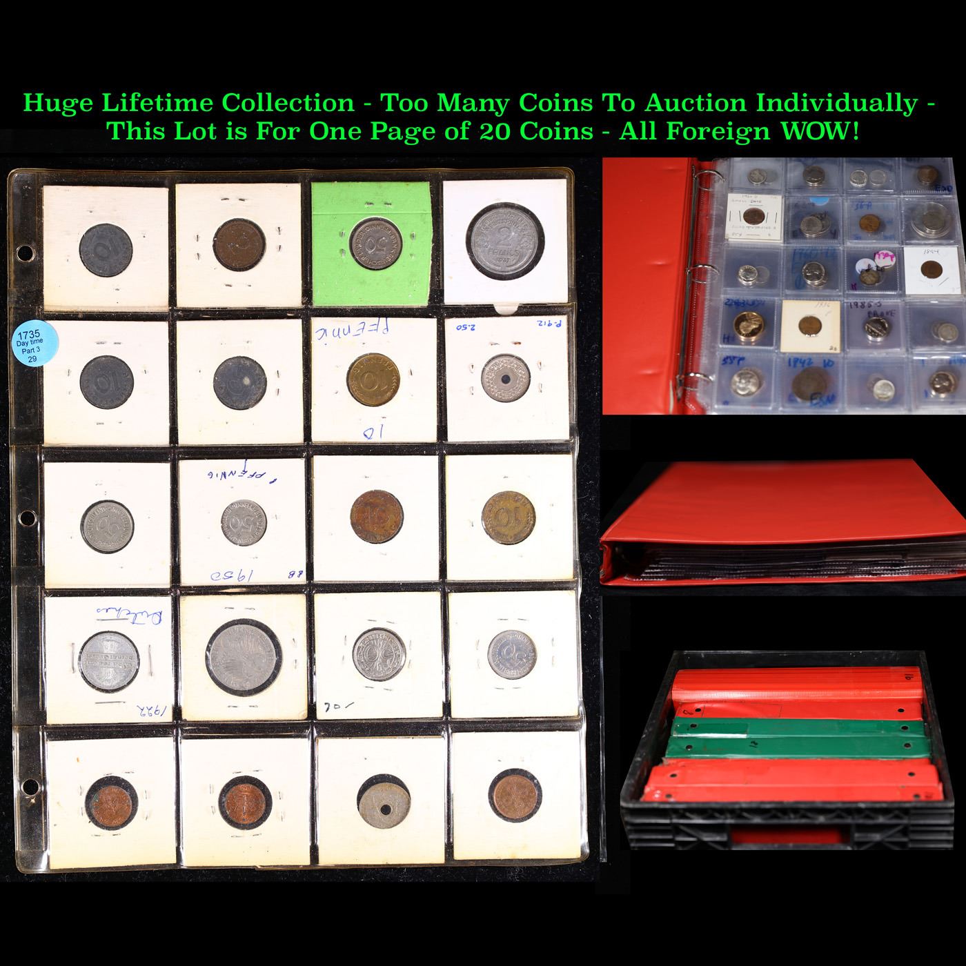 Huge Liifetime Collection - Too Many Coins To Auction Individually - This Lot is For One Page of 20 Foreign Coins. We have received a huge collection of over 10 thousand US coins in flips, 2x2 holders, and 20 coin pages. We are forced, due to limited lots, to sell this collection in pages of 20 coins. All of the pages include Silver Coins. Most contain Indian Cents, Proof Coins, Barber Coinage, Bust Coinage, Lincoln Cents, Flying Eagles, Jefferson Nickels, Roosevelt Dimes, Buffalo Nickels, Eisenhower Dollars, Kennedy Halves, Large Cents including some Draped Bust Large Cents, Mercury Dimes, and Liberty V Nickels. These pages could not be reviewed by anyone in our office due to time constraints. We estimate the value of each page to meet or exceed $200 in value! Good luck and happy hunting.