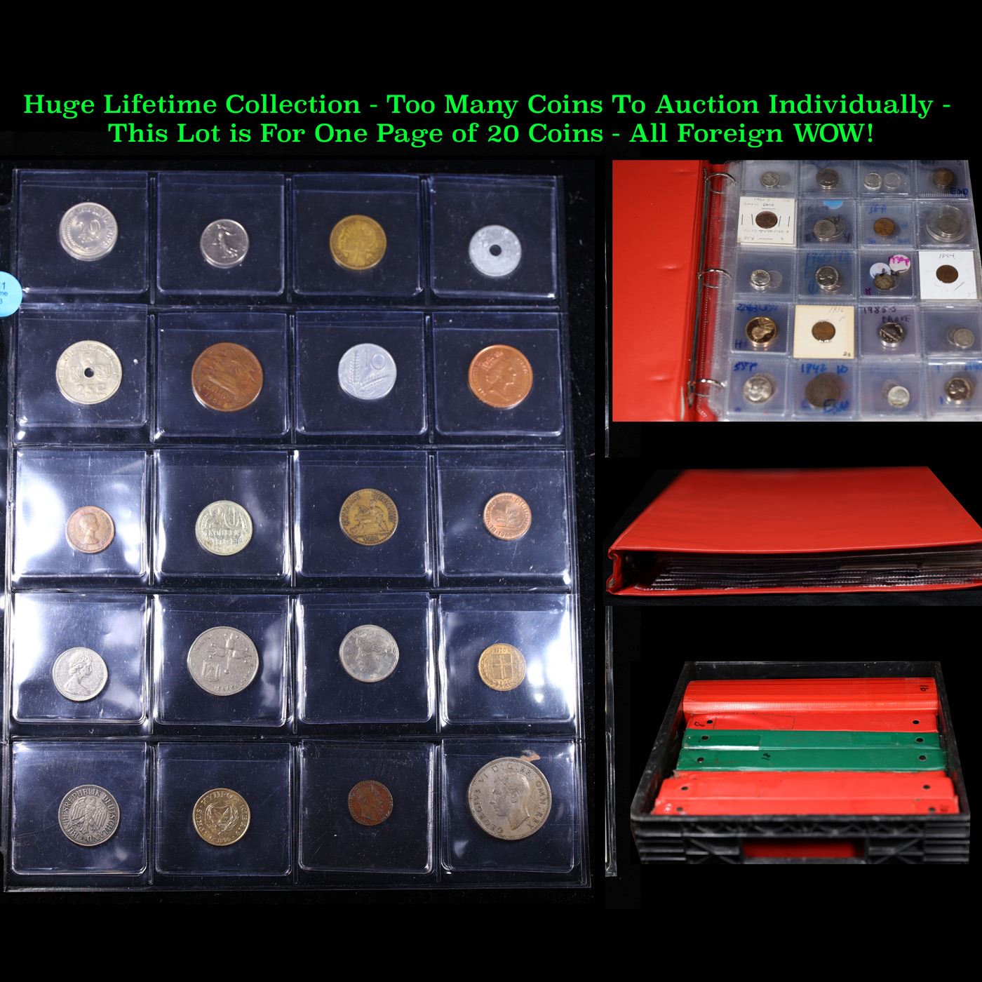 Huge Liifetime Collection - Too Many Coins To Auction Individually - This Lot is For One Page of 20 Foreign Coins. We have received a huge collection of over 10 thousand US coins in flips, 2x2 holders, and 20 coin pages. We are forced, due to limited lots, to sell this collection in pages of 20 coins. All of the pages include Silver Coins. Most contain Indian Cents, Proof Coins, Barber Coinage, Bust Coinage, Lincoln Cents, Flying Eagles, Jefferson Nickels, Roosevelt Dimes, Buffalo Nickels, Eisenhower Dollars, Kennedy Halves, Large Cents including some Draped Bust Large Cents, Mercury Dimes, and Liberty V Nickels. These pages could not be reviewed by anyone in our office due to time constraints. We estimate the value of each page to meet or exceed $200 in value! Good luck and happy hunting.