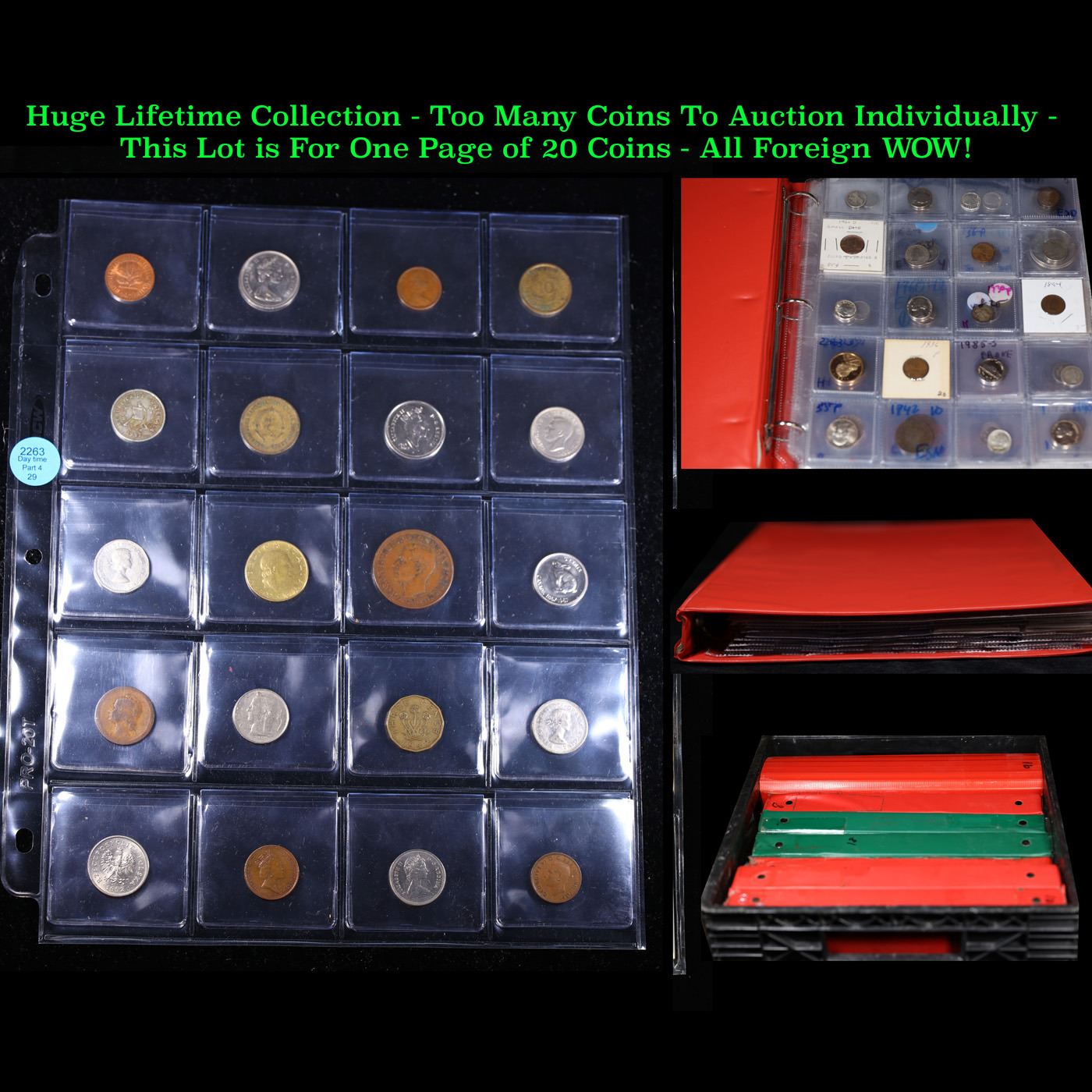 Huge Liifetime Collection - Too Many Coins To Auction Individually - This Lot is For One Page of 20 Foreign Coins. We have received a huge collection of over 10 thousand US coins in flips, 2x2 holders, and 20 coin pages. We are forced, due to limited lots, to sell this collection in pages of 20 coins. All of the pages include Silver Coins. Most contain Indian Cents, Proof Coins, Barber Coinage, Bust Coinage, Lincoln Cents, Flying Eagles, Jefferson Nickels, Roosevelt Dimes, Buffalo Nickels, Eisenhower Dollars, Kennedy Halves, Large Cents including some Draped Bust Large Cents, Mercury Dimes, and Liberty V Nickels. These pages could not be reviewed by anyone in our office due to time constraints. We estimate the value of each page to meet or exceed $200 in value! Good luck and happy hunting.