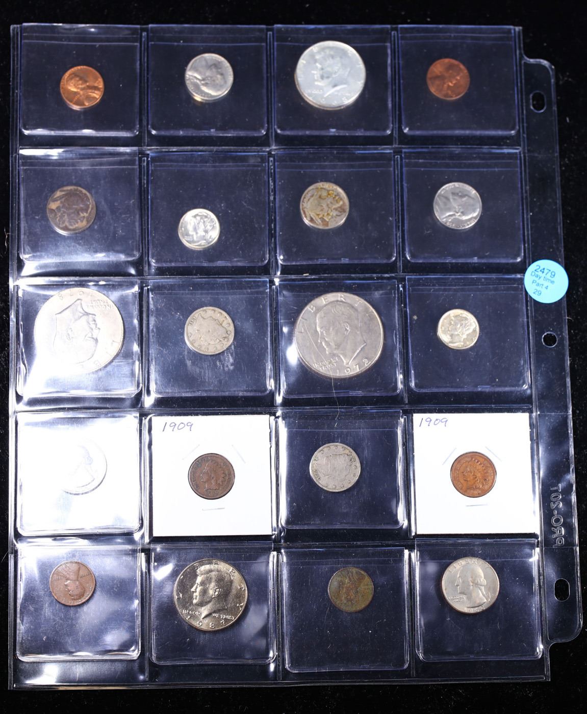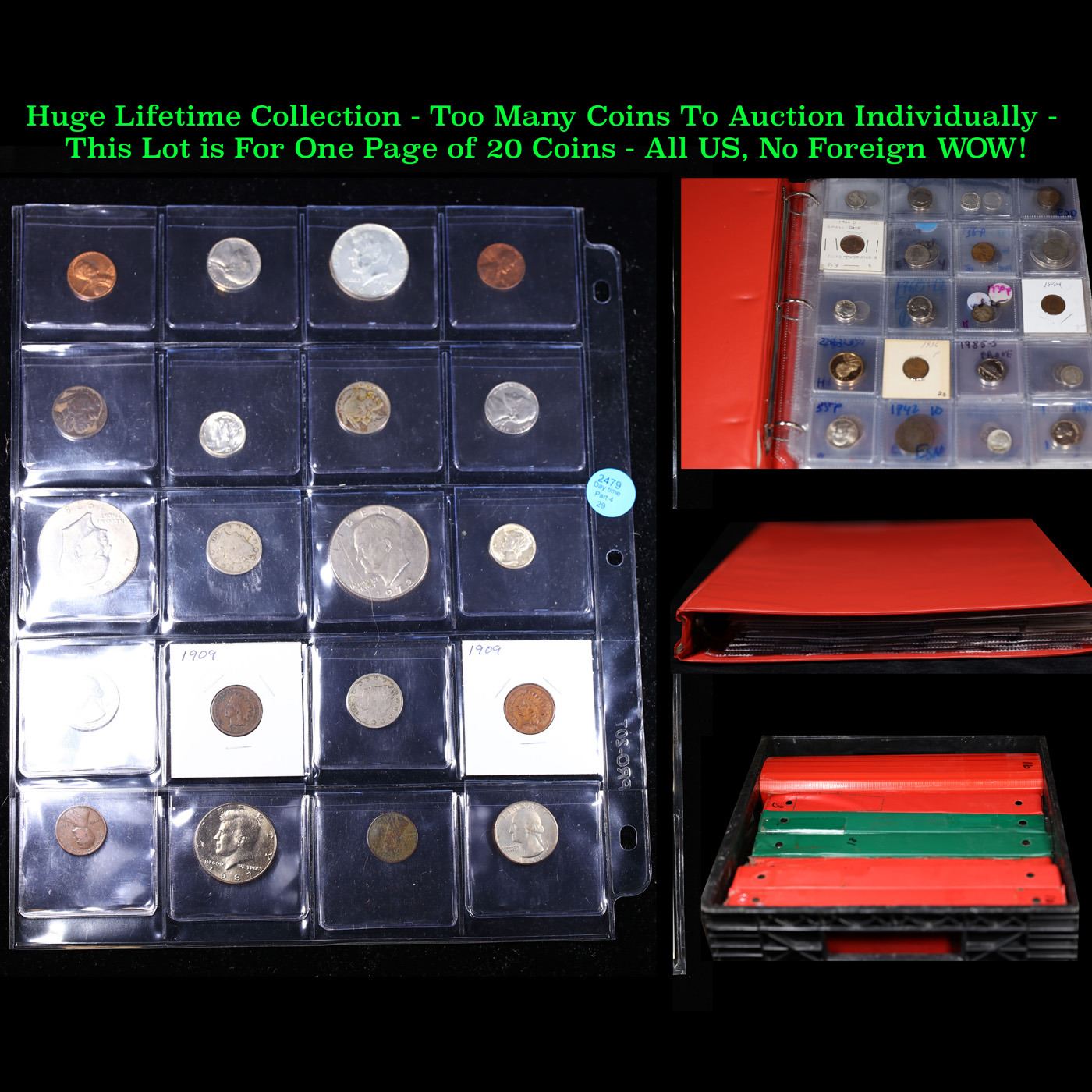 Huge Liifetime Collection - Too Many Coins To Auction Individually - This Lot is For One Page of 20 Coins - All US, No Foreign WOW!. We have received a huge collection of over 10 thousand US coins in flips, 2x2 holders, and 20 coin pages. We are forced, due to limited lots, to sell this collection in pages of 20 coins. All of the pages include Silver Coins. Most contain Indian Cents, Proof Coins, Barber Coinage, Bust Coinage, Lincoln Cents, Flying Eagles, Jefferson Nickels, Roosevelt Dimes, Buffalo Nickels, Eisenhower Dollars, Kennedy Halves, Large Cents including some Draped Bust Large Cents, Mercury Dimes, and Liberty V Nickels. These pages could not be reviewed by anyone in our office due to time constraints. We estimate the value of each page to meet or exceed $200 in value! Good luck and happy hunting.