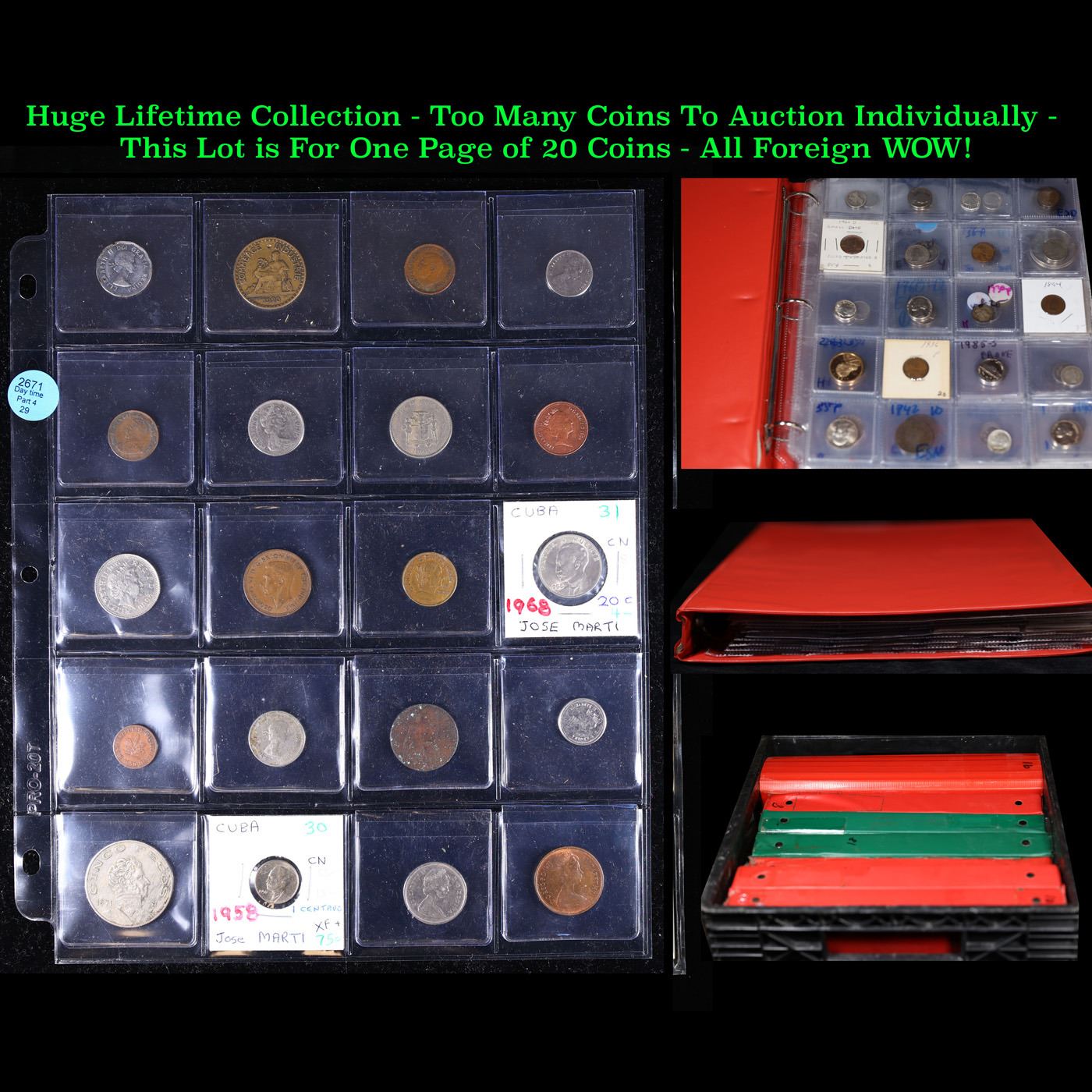 Huge Liifetime Collection - Too Many Coins To Auction Individually - This Lot is For One Page of 20 Foreign Coins. We have received a huge collection of over 10 thousand US coins in flips, 2x2 holders, and 20 coin pages. We are forced, due to limited lots, to sell this collection in pages of 20 coins. All of the pages include Silver Coins. Most contain Indian Cents, Proof Coins, Barber Coinage, Bust Coinage, Lincoln Cents, Flying Eagles, Jefferson Nickels, Roosevelt Dimes, Buffalo Nickels, Eisenhower Dollars, Kennedy Halves, Large Cents including some Draped Bust Large Cents, Mercury Dimes, and Liberty V Nickels. These pages could not be reviewed by anyone in our office due to time constraints. We estimate the value of each page to meet or exceed $200 in value! Good luck and happy hunting.