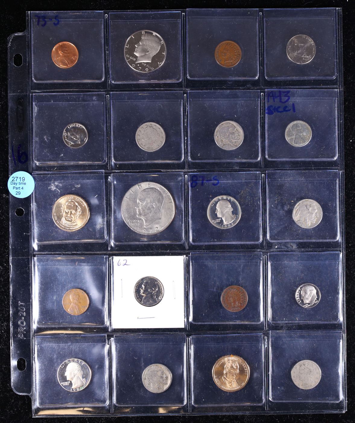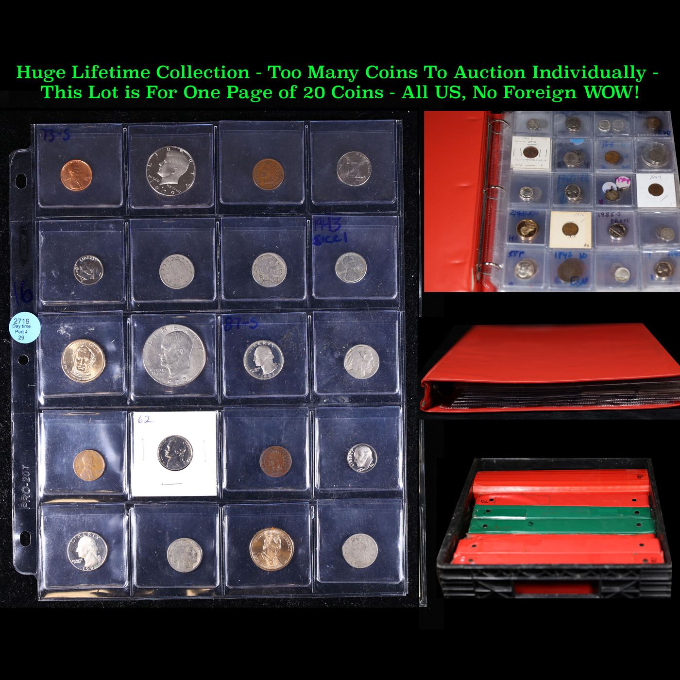 Huge Liifetime Collection - Too Many Coins To Auction Individually - This Lot is For One Page of 20 Coins - All US, No Foreign WOW!. We have received a huge collection of over 10 thousand US coins in flips, 2x2 holders, and 20 coin pages. We are forced, due to limited lots, to sell this collection in pages of 20 coins. All of the pages include Silver Coins. Most contain Indian Cents, Proof Coins, Barber Coinage, Bust Coinage, Lincoln Cents, Flying Eagles, Jefferson Nickels, Roosevelt Dimes, Buffalo Nickels, Eisenhower Dollars, Kennedy Halves, Large Cents including some Draped Bust Large Cents, Mercury Dimes, and Liberty V Nickels. These pages could not be reviewed by anyone in our office due to time constraints. We estimate the value of each page to meet or exceed $200 in value! Good luck and happy hunting.