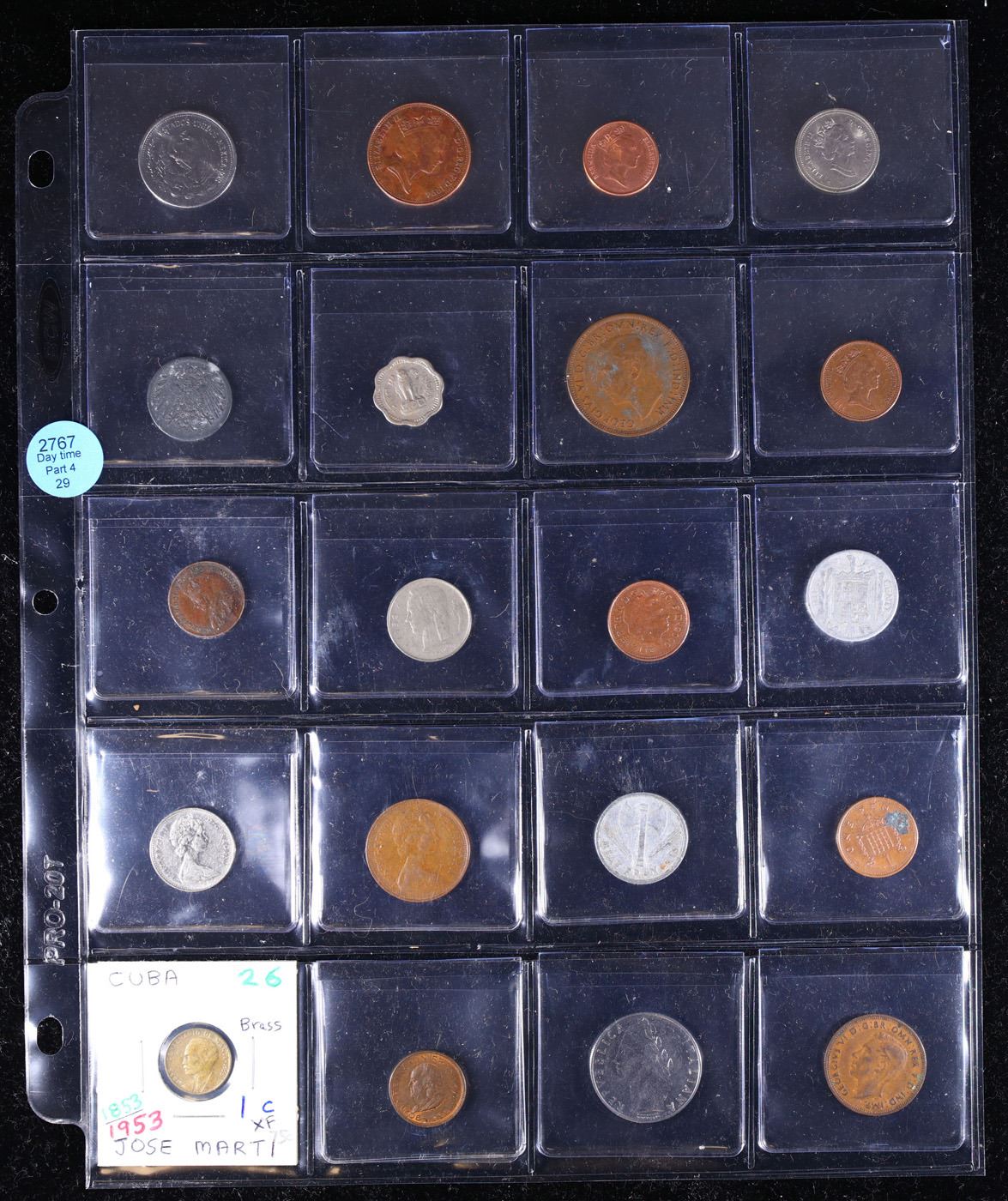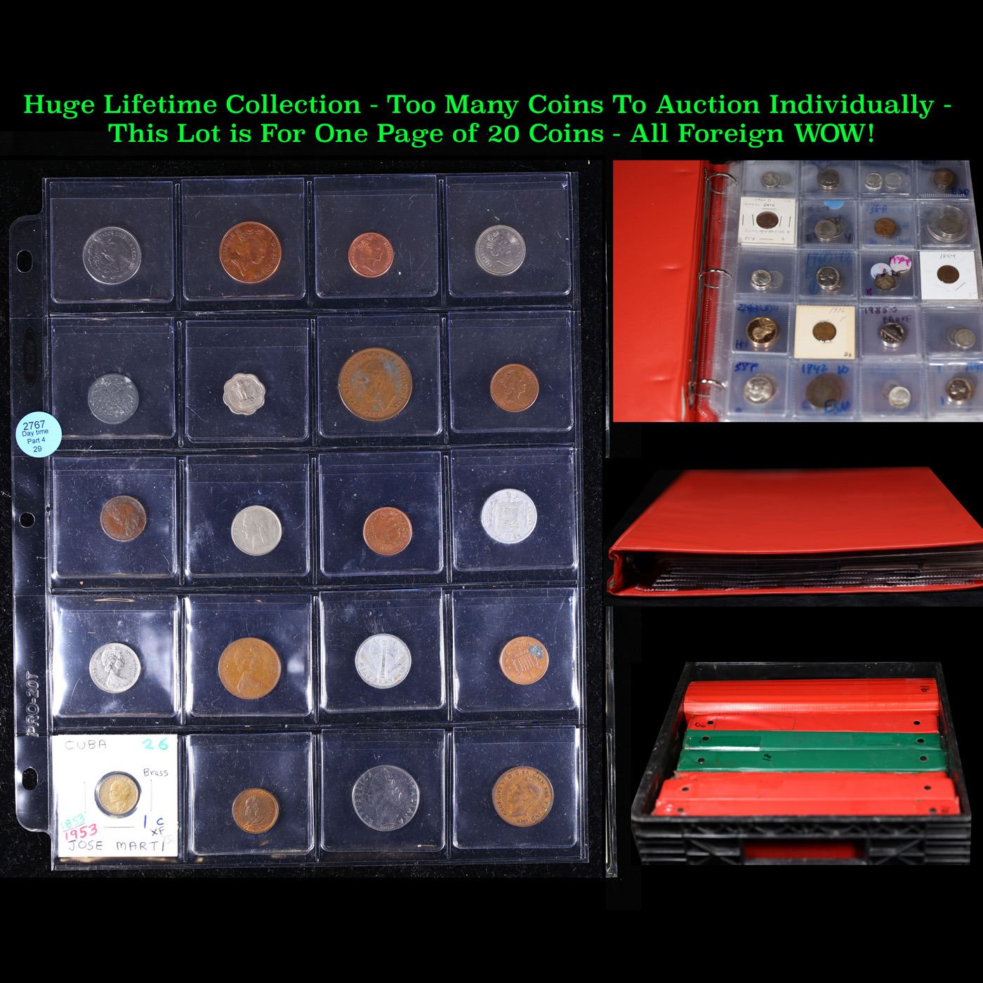 Huge Liifetime Collection - Too Many Coins To Auction Individually - This Lot is For One Page of 20 Foreign Coins. We have received a huge collection of over 10 thousand US coins in flips, 2x2 holders, and 20 coin pages. We are forced, due to limited lots, to sell this collection in pages of 20 coins. All of the pages include Silver Coins. Most contain Indian Cents, Proof Coins, Barber Coinage, Bust Coinage, Lincoln Cents, Flying Eagles, Jefferson Nickels, Roosevelt Dimes, Buffalo Nickels, Eisenhower Dollars, Kennedy Halves, Large Cents including some Draped Bust Large Cents, Mercury Dimes, and Liberty V Nickels. These pages could not be reviewed by anyone in our office due to time constraints. We estimate the value of each page to meet or exceed $200 in value! Good luck and happy hunting.