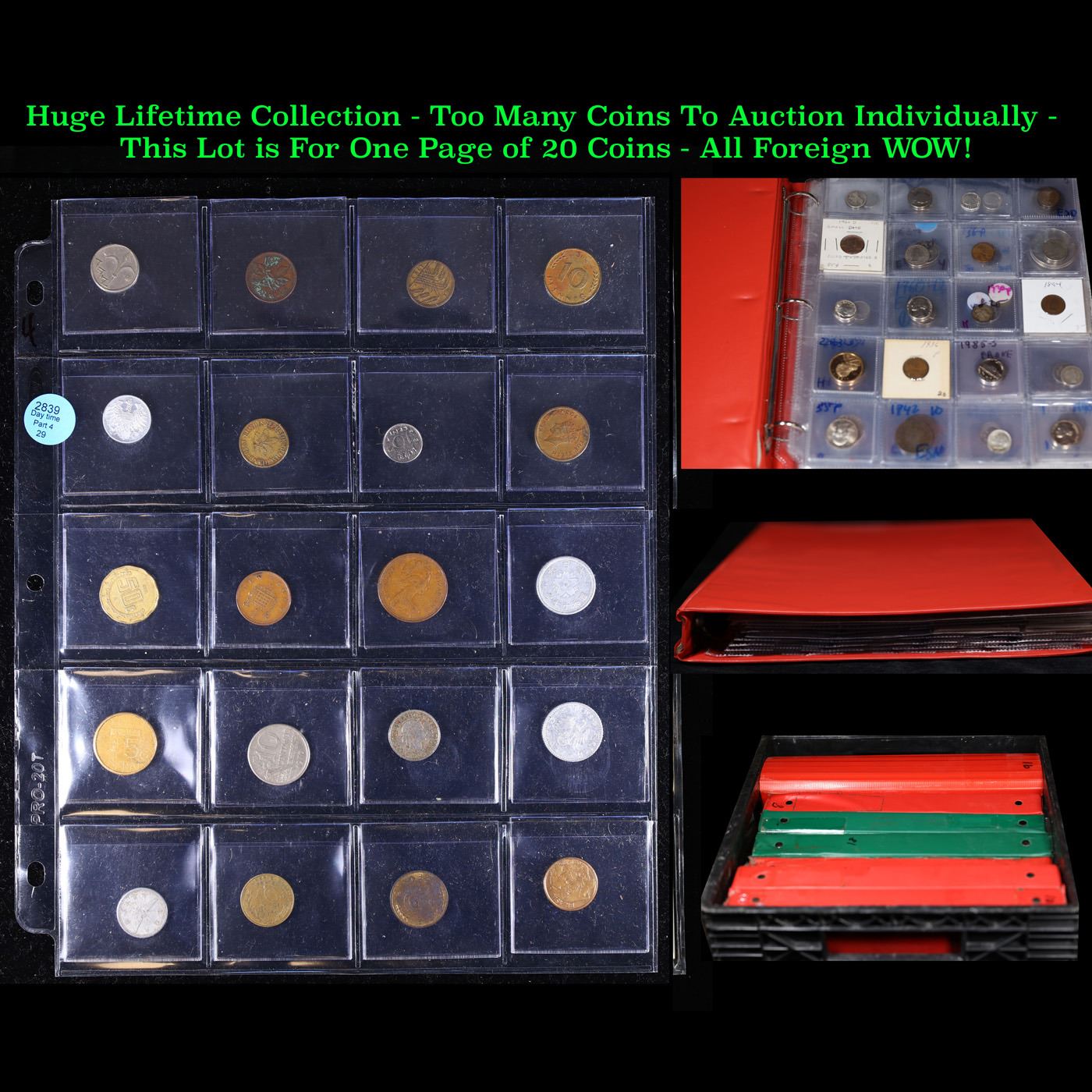 Huge Liifetime Collection - Too Many Coins To Auction Individually - This Lot is For One Page of 20 Foreign Coins. We have received a huge collection of over 10 thousand US coins in flips, 2x2 holders, and 20 coin pages. We are forced, due to limited lots, to sell this collection in pages of 20 coins. All of the pages include Silver Coins. Most contain Indian Cents, Proof Coins, Barber Coinage, Bust Coinage, Lincoln Cents, Flying Eagles, Jefferson Nickels, Roosevelt Dimes, Buffalo Nickels, Eisenhower Dollars, Kennedy Halves, Large Cents including some Draped Bust Large Cents, Mercury Dimes, and Liberty V Nickels. These pages could not be reviewed by anyone in our office due to time constraints. We estimate the value of each page to meet or exceed $200 in value! Good luck and happy hunting.