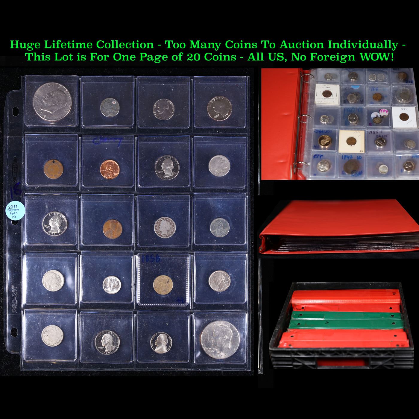 Huge Liifetime Collection - Too Many Coins To Auction Individually - This Lot is For One Page of 20 Coins - All US, No Foreign WOW!. We have received a huge collection of over 10 thousand US coins in flips, 2x2 holders, and 20 coin pages. We are forced, due to limited lots, to sell this collection in pages of 20 coins. All of the pages include Silver Coins. Most contain Indian Cents, Proof Coins, Barber Coinage, Bust Coinage, Lincoln Cents, Flying Eagles, Jefferson Nickels, Roosevelt Dimes, Buffalo Nickels, Eisenhower Dollars, Kennedy Halves, Large Cents including some Draped Bust Large Cents, Mercury Dimes, and Liberty V Nickels. These pages could not be reviewed by anyone in our office due to time constraints. We estimate the value of each page to meet or exceed $200 in value! Good luck and happy hunting.