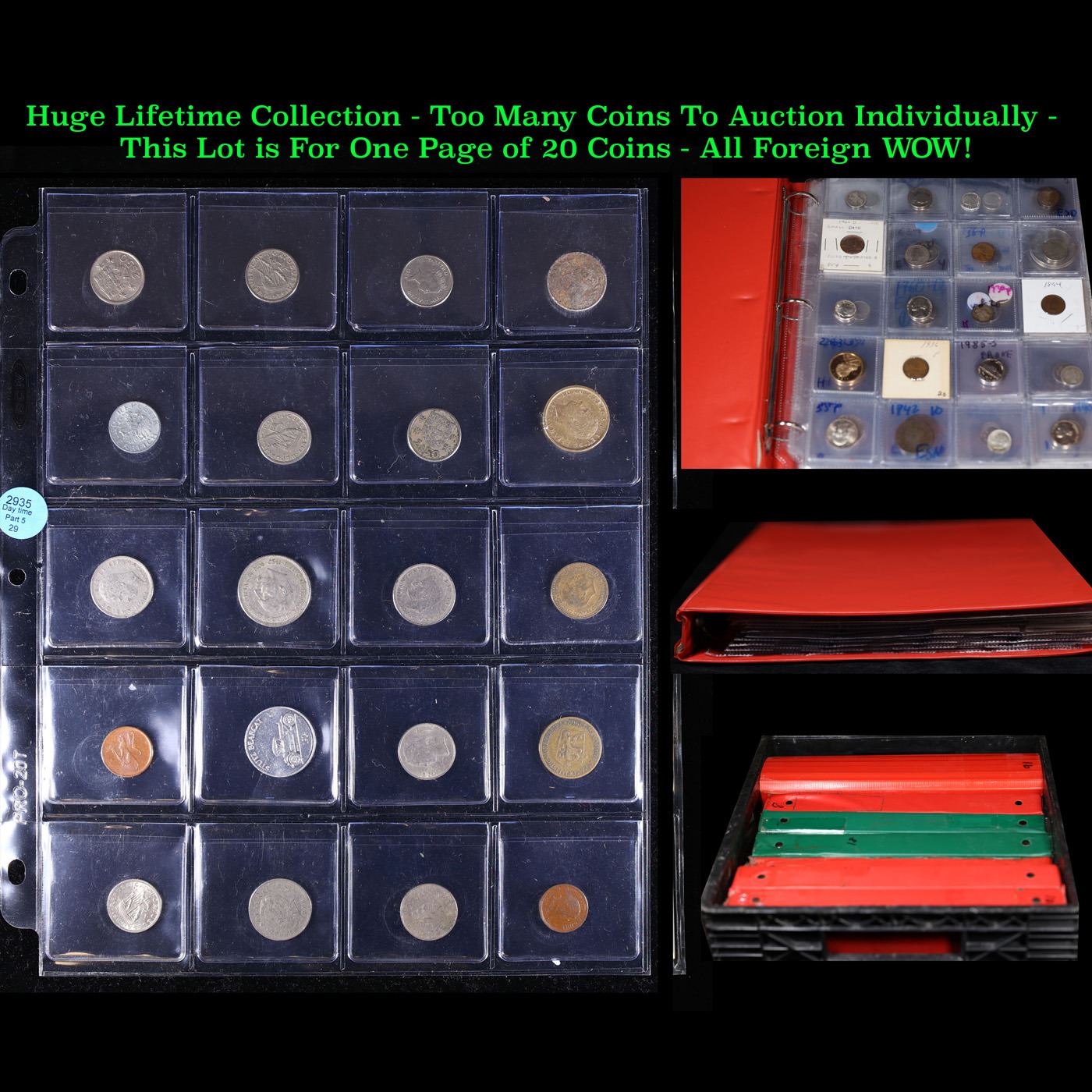 Huge Liifetime Collection - Too Many Coins To Auction Individually - This Lot is For One Page of 20 Foreign Coins. We have received a huge collection of over 10 thousand US coins in flips, 2x2 holders, and 20 coin pages. We are forced, due to limited lots, to sell this collection in pages of 20 coins. All of the pages include Silver Coins. Most contain Indian Cents, Proof Coins, Barber Coinage, Bust Coinage, Lincoln Cents, Flying Eagles, Jefferson Nickels, Roosevelt Dimes, Buffalo Nickels, Eisenhower Dollars, Kennedy Halves, Large Cents including some Draped Bust Large Cents, Mercury Dimes, and Liberty V Nickels. These pages could not be reviewed by anyone in our office due to time constraints. We estimate the value of each page to meet or exceed $200 in value! Good luck and happy hunting.