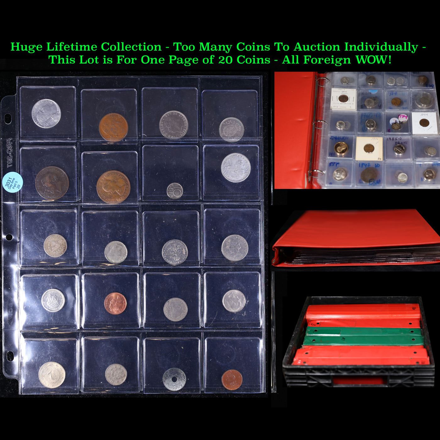 Huge Liifetime Collection - Too Many Coins To Auction Individually - This Lot is For One Page of 20 Foreign Coins. We have received a huge collection of over 10 thousand US coins in flips, 2x2 holders, and 20 coin pages. We are forced, due to limited lots, to sell this collection in pages of 20 coins. All of the pages include Silver Coins. Most contain Indian Cents, Proof Coins, Barber Coinage, Bust Coinage, Lincoln Cents, Flying Eagles, Jefferson Nickels, Roosevelt Dimes, Buffalo Nickels, Eisenhower Dollars, Kennedy Halves, Large Cents including some Draped Bust Large Cents, Mercury Dimes, and Liberty V Nickels. These pages could not be reviewed by anyone in our office due to time constraints. We estimate the value of each page to meet or exceed $200 in value! Good luck and happy hunting.