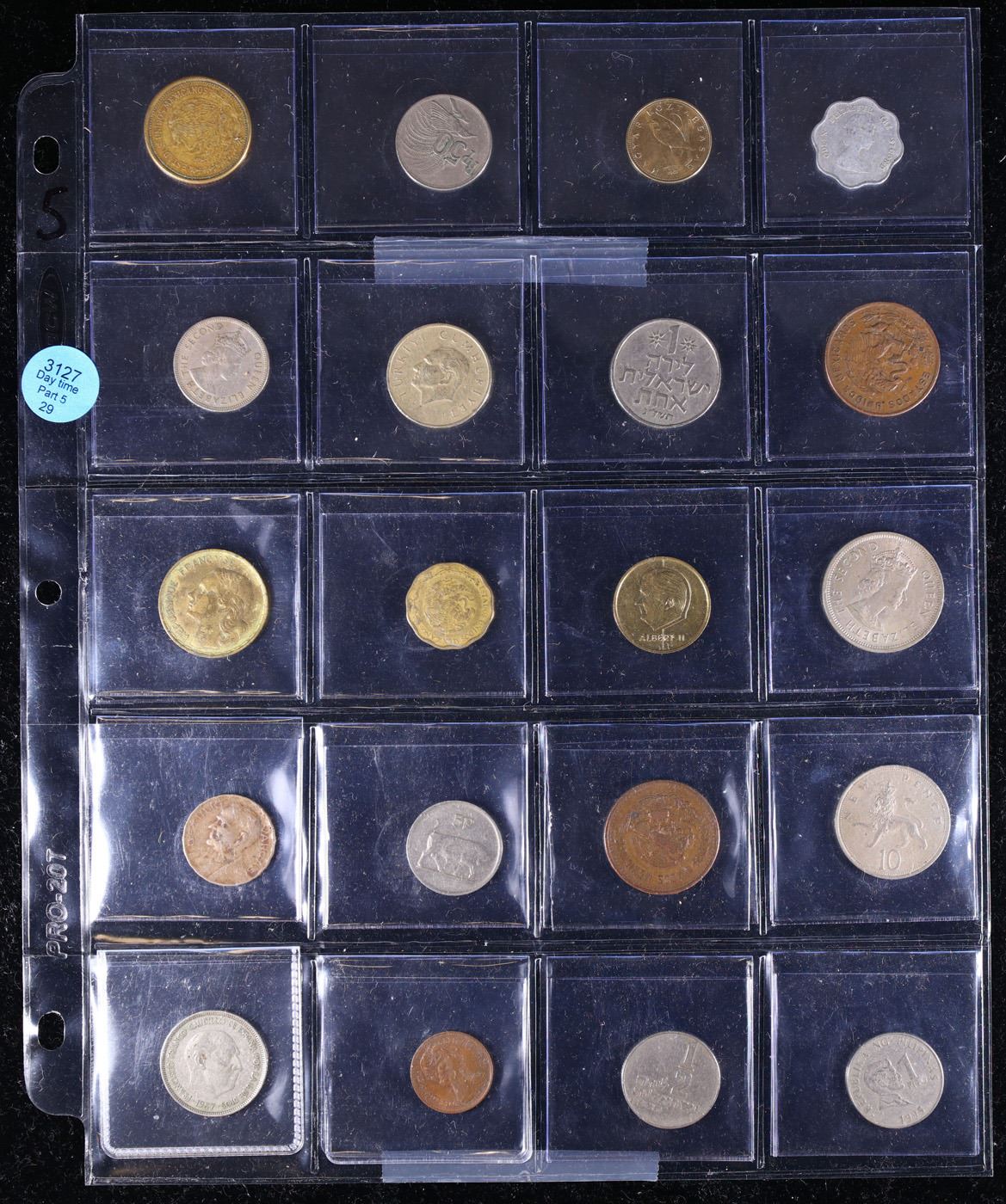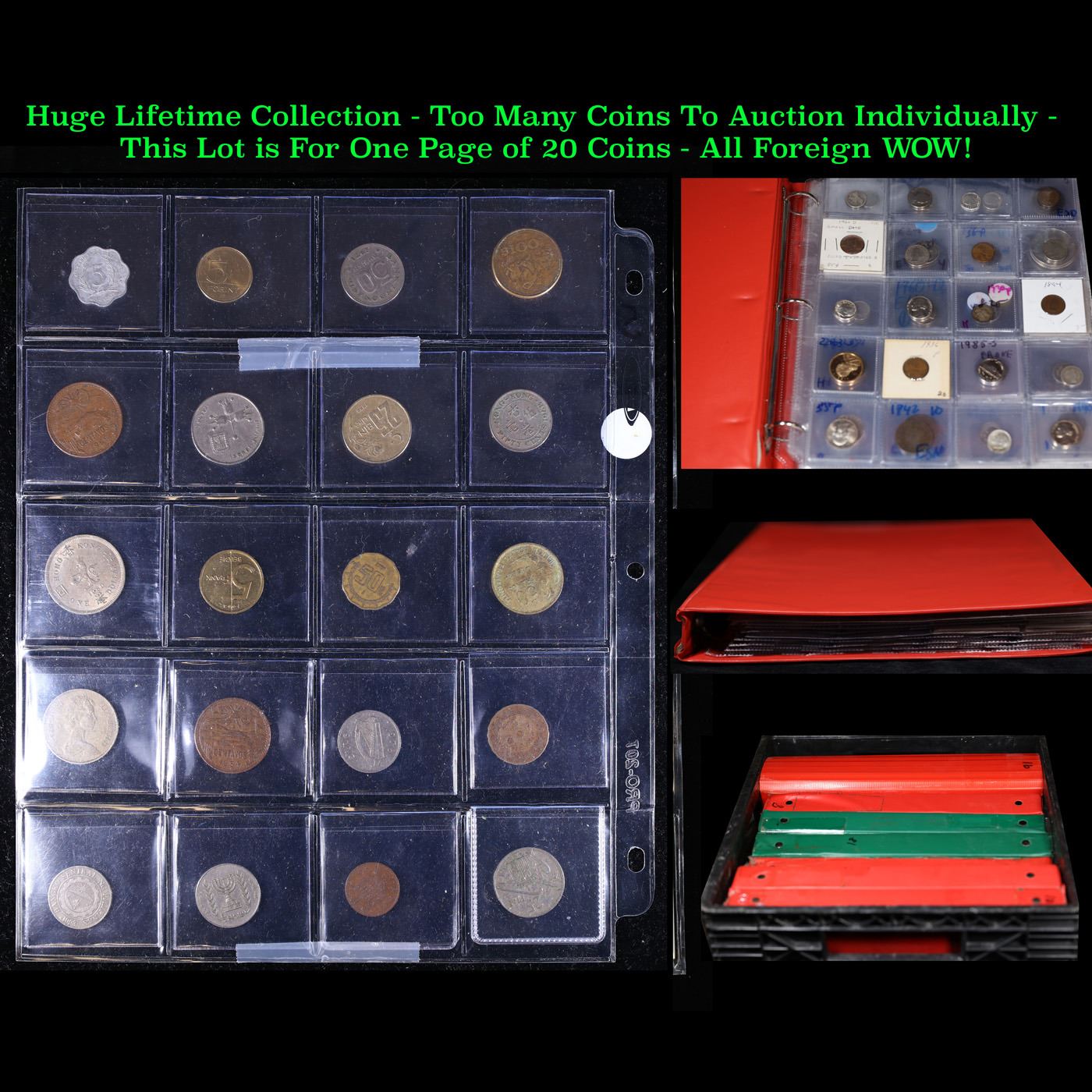 Huge Liifetime Collection - Too Many Coins To Auction Individually - This Lot is For One Page of 20 Foreign Coins. We have received a huge collection of over 10 thousand US coins in flips, 2x2 holders, and 20 coin pages. We are forced, due to limited lots, to sell this collection in pages of 20 coins. All of the pages include Silver Coins. Most contain Indian Cents, Proof Coins, Barber Coinage, Bust Coinage, Lincoln Cents, Flying Eagles, Jefferson Nickels, Roosevelt Dimes, Buffalo Nickels, Eisenhower Dollars, Kennedy Halves, Large Cents including some Draped Bust Large Cents, Mercury Dimes, and Liberty V Nickels. These pages could not be reviewed by anyone in our office due to time constraints. We estimate the value of each page to meet or exceed $200 in value! Good luck and happy hunting.
