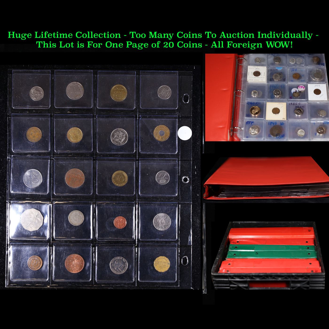 Huge Liifetime Collection - Too Many Coins To Auction Individually - This Lot is For One Page of 20 Foreign Coins. We have received a huge collection of over 10 thousand US coins in flips, 2x2 holders, and 20 coin pages. We are forced, due to limited lots, to sell this collection in pages of 20 coins. All of the pages include Silver Coins. Most contain Indian Cents, Proof Coins, Barber Coinage, Bust Coinage, Lincoln Cents, Flying Eagles, Jefferson Nickels, Roosevelt Dimes, Buffalo Nickels, Eisenhower Dollars, Kennedy Halves, Large Cents including some Draped Bust Large Cents, Mercury Dimes, and Liberty V Nickels. These pages could not be reviewed by anyone in our office due to time constraints. We estimate the value of each page to meet or exceed $200 in value! Good luck and happy hunting.