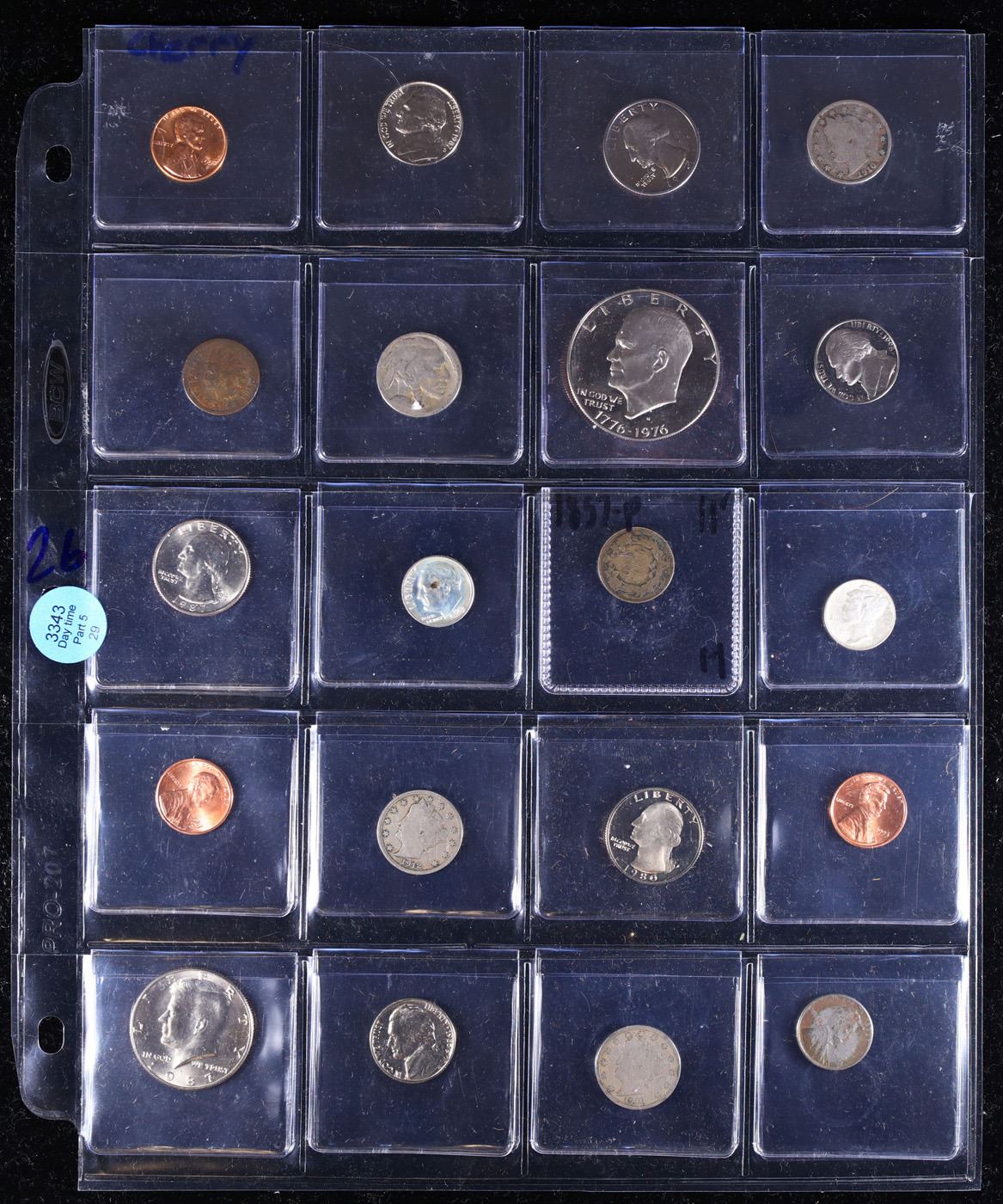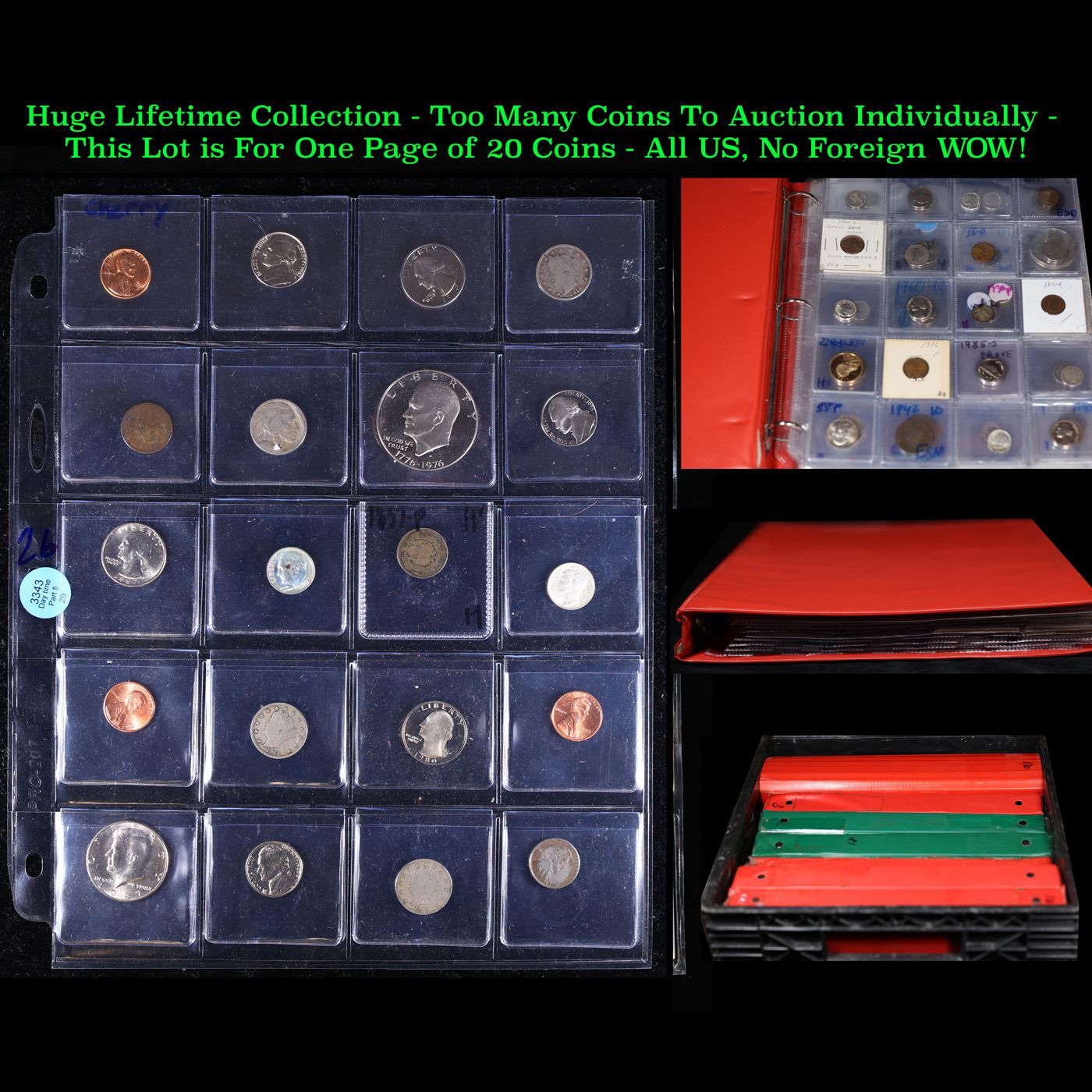 Huge Liifetime Collection - Too Many Coins To Auction Individually - This Lot is For One Page of 20 Coins - All US, No Foreign WOW!. We have received a huge collection of over 10 thousand US coins in flips, 2x2 holders, and 20 coin pages. We are forced, due to limited lots, to sell this collection in pages of 20 coins. All of the pages include Silver Coins. Most contain Indian Cents, Proof Coins, Barber Coinage, Bust Coinage, Lincoln Cents, Flying Eagles, Jefferson Nickels, Roosevelt Dimes, Buffalo Nickels, Eisenhower Dollars, Kennedy Halves, Large Cents including some Draped Bust Large Cents, Mercury Dimes, and Liberty V Nickels. These pages could not be reviewed by anyone in our office due to time constraints. We estimate the value of each page to meet or exceed $200 in value! Good luck and happy hunting.