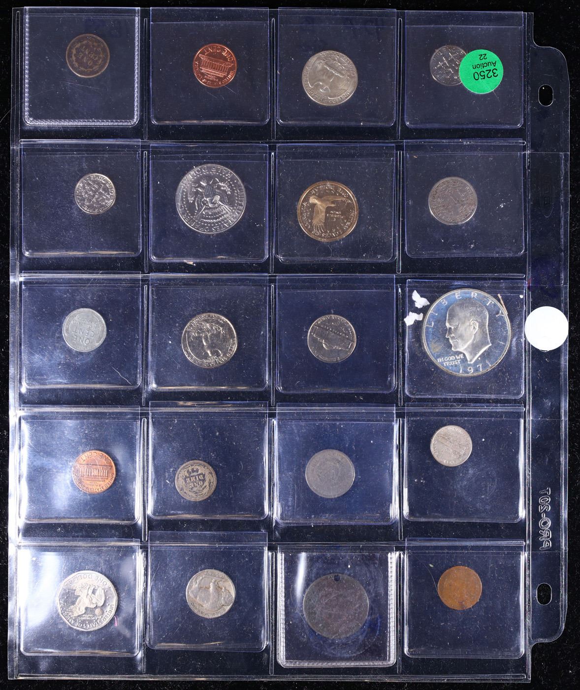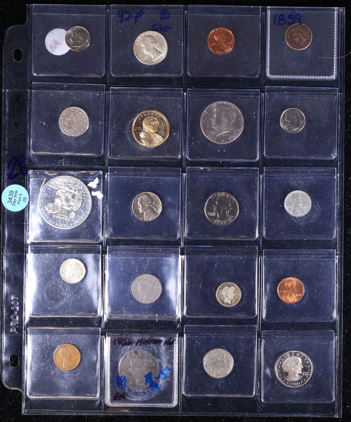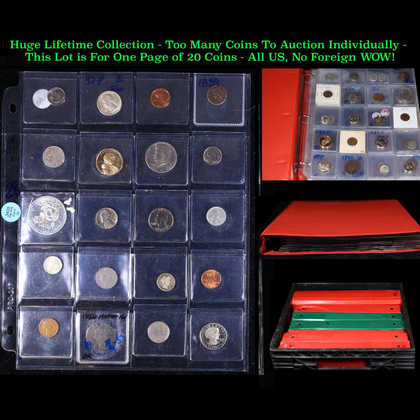 Huge Liifetime Collection - Too Many Coins To Auction Individually - This Lot is For One Page of 20 Coins - All US, No Foreign WOW!. We have received a huge collection of over 10 thousand US coins in flips, 2x2 holders, and 20 coin pages. We are forced, due to limited lots, to sell this collection in pages of 20 coins. All of the pages include Silver Coins. Most contain Indian Cents, Proof Coins, Barber Coinage, Bust Coinage, Lincoln Cents, Flying Eagles, Jefferson Nickels, Roosevelt Dimes, Buffalo Nickels, Eisenhower Dollars, Kennedy Halves, Large Cents including some Draped Bust Large Cents, Mercury Dimes, and Liberty V Nickels. These pages could not be reviewed by anyone in our office due to time constraints. We estimate the value of each page to meet or exceed $200 in value! Good luck and happy hunting.