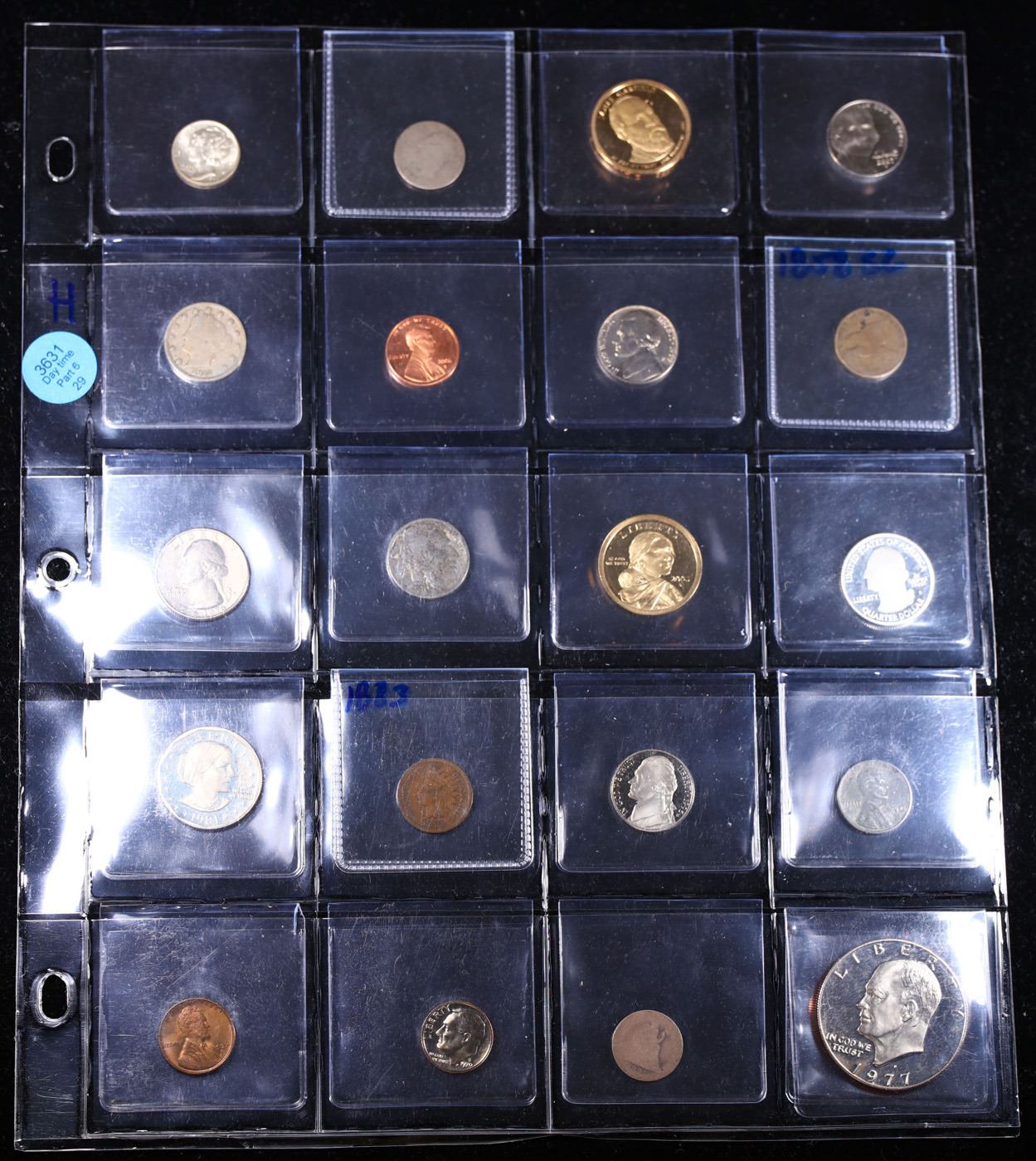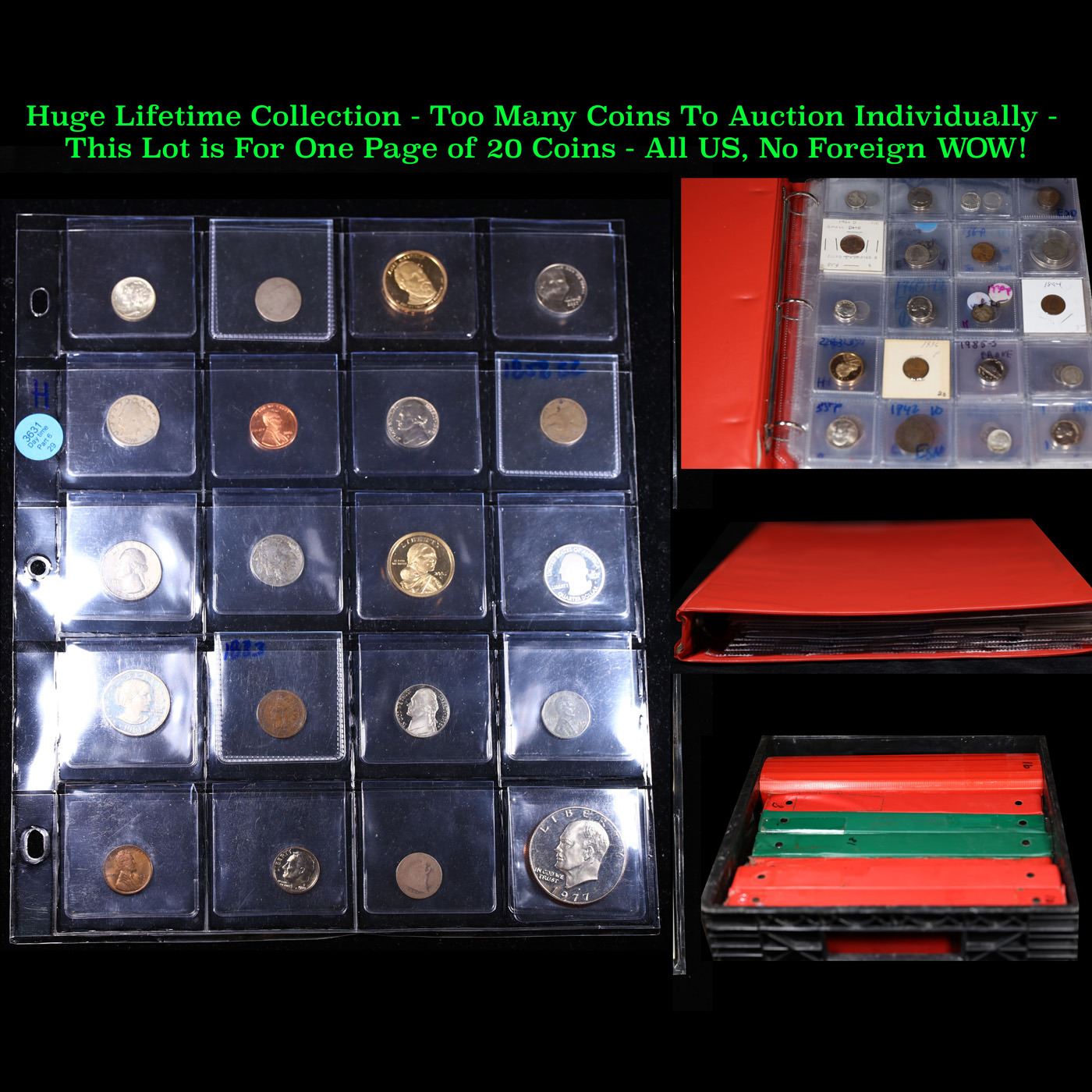 Huge Liifetime Collection - Too Many Coins To Auction Individually - This Lot is For One Page of 20 Coins - All US, No Foreign WOW!. We have received a huge collection of over 10 thousand US coins in flips, 2x2 holders, and 20 coin pages. We are forced, due to limited lots, to sell this collection in pages of 20 coins. All of the pages include Silver Coins. Most contain Indian Cents, Proof Coins, Barber Coinage, Bust Coinage, Lincoln Cents, Flying Eagles, Jefferson Nickels, Roosevelt Dimes, Buffalo Nickels, Eisenhower Dollars, Kennedy Halves, Large Cents including some Draped Bust Large Cents, Mercury Dimes, and Liberty V Nickels. These pages could not be reviewed by anyone in our office due to time constraints. We estimate the value of each page to meet or exceed $200 in value! Good luck and happy hunting.