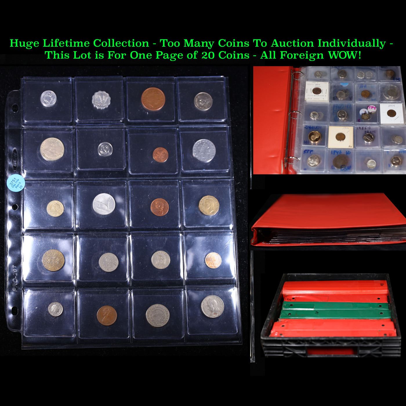 Huge Liifetime Collection - Too Many Coins To Auction Individually - This Lot is For One Page of 20 Foreign Coins. We have received a huge collection of over 10 thousand US coins in flips, 2x2 holders, and 20 coin pages. We are forced, due to limited lots, to sell this collection in pages of 20 coins. All of the pages include Silver Coins. Most contain Indian Cents, Proof Coins, Barber Coinage, Bust Coinage, Lincoln Cents, Flying Eagles, Jefferson Nickels, Roosevelt Dimes, Buffalo Nickels, Eisenhower Dollars, Kennedy Halves, Large Cents including some Draped Bust Large Cents, Mercury Dimes, and Liberty V Nickels. These pages could not be reviewed by anyone in our office due to time constraints. We estimate the value of each page to meet or exceed $200 in value! Good luck and happy hunting.