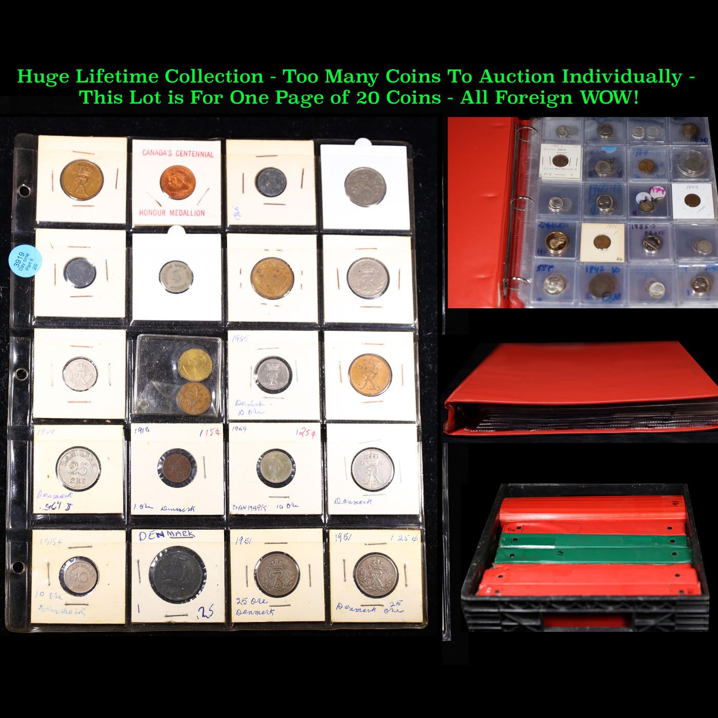 Huge Liifetime Collection - Too Many Coins To Auction Individually - This Lot is For One Page of 20 Foreign Coins. We have received a huge collection of over 10 thousand US coins in flips, 2x2 holders, and 20 coin pages. We are forced, due to limited lots, to sell this collection in pages of 20 coins. All of the pages include Silver Coins. Most contain Indian Cents, Proof Coins, Barber Coinage, Bust Coinage, Lincoln Cents, Flying Eagles, Jefferson Nickels, Roosevelt Dimes, Buffalo Nickels, Eisenhower Dollars, Kennedy Halves, Large Cents including some Draped Bust Large Cents, Mercury Dimes, and Liberty V Nickels. These pages could not be reviewed by anyone in our office due to time constraints. We estimate the value of each page to meet or exceed $200 in value! Good luck and happy hunting.