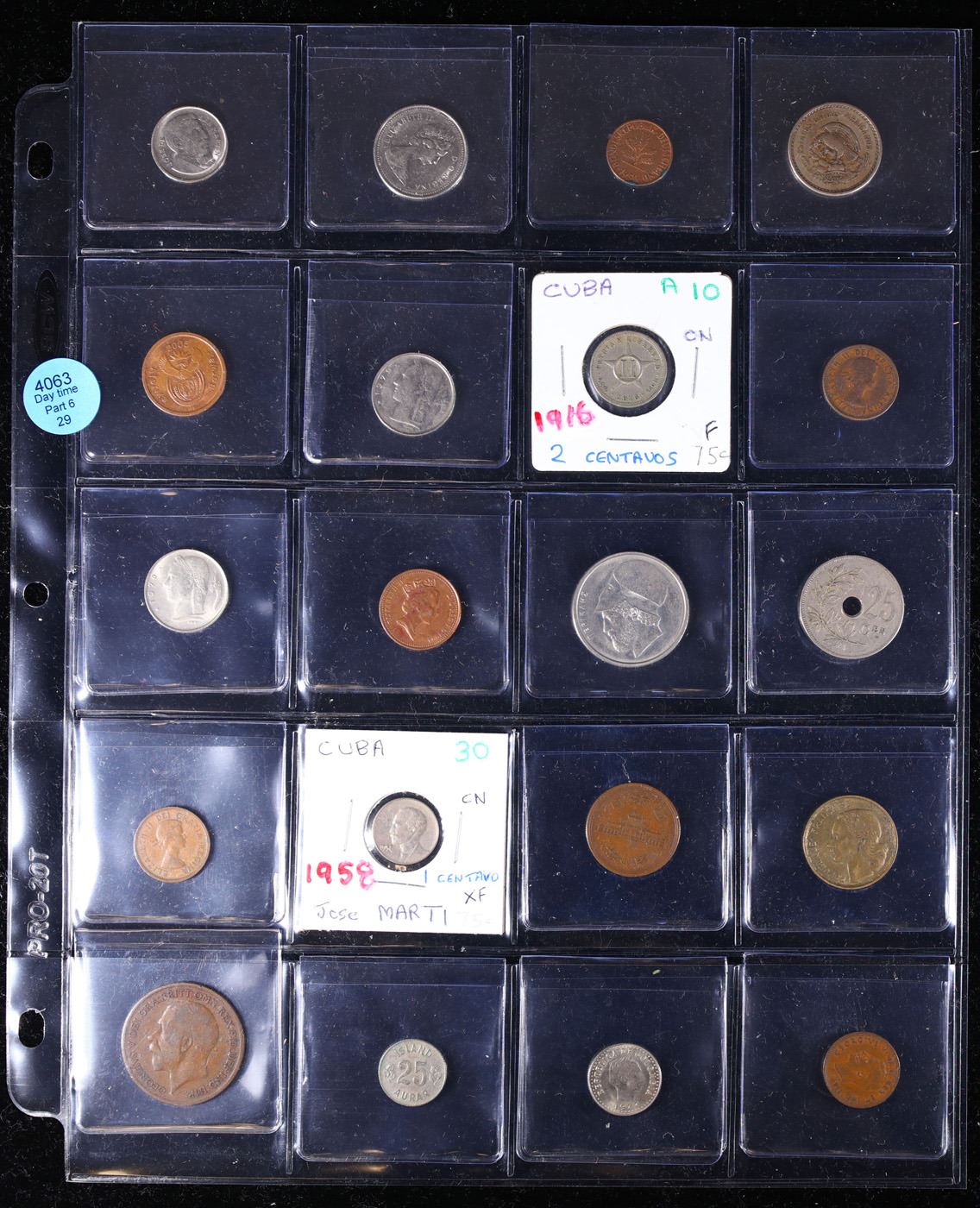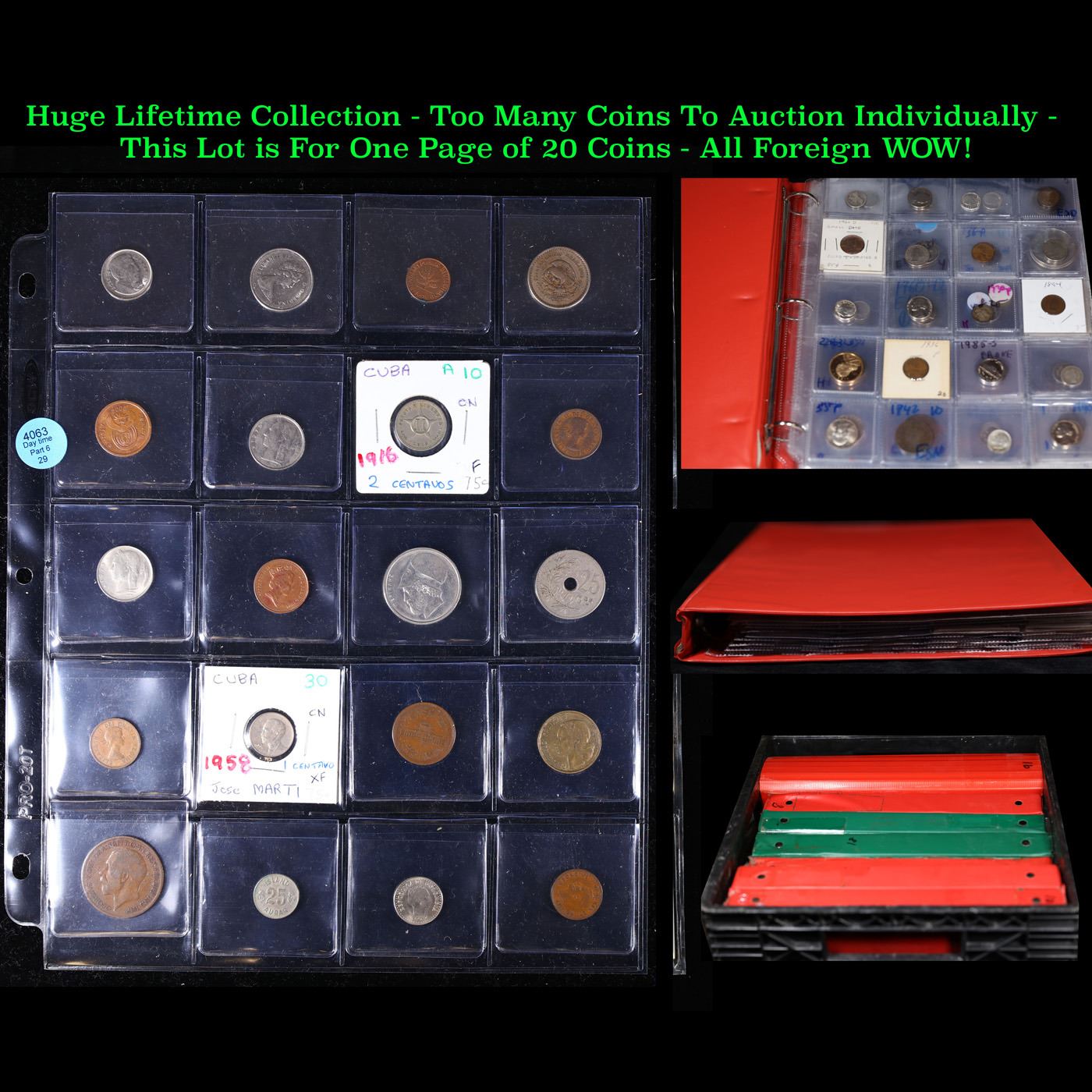 Huge Liifetime Collection - Too Many Coins To Auction Individually - This Lot is For One Page of 20 Foreign Coins. We have received a huge collection of over 10 thousand US coins in flips, 2x2 holders, and 20 coin pages. We are forced, due to limited lots, to sell this collection in pages of 20 coins. All of the pages include Silver Coins. Most contain Indian Cents, Proof Coins, Barber Coinage, Bust Coinage, Lincoln Cents, Flying Eagles, Jefferson Nickels, Roosevelt Dimes, Buffalo Nickels, Eisenhower Dollars, Kennedy Halves, Large Cents including some Draped Bust Large Cents, Mercury Dimes, and Liberty V Nickels. These pages could not be reviewed by anyone in our office due to time constraints. We estimate the value of each page to meet or exceed $200 in value! Good luck and happy hunting.