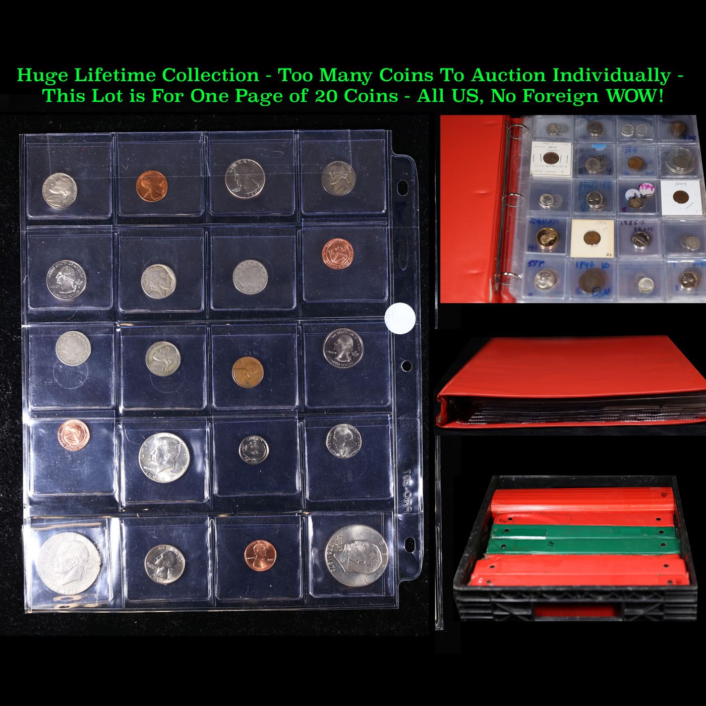 Huge Liifetime Collection - Too Many Coins To Auction Individually - This Lot is For One Page of 20 Coins - All US, No Foreign WOW!. We have received a huge collection of over 10 thousand US coins in flips, 2x2 holders, and 20 coin pages. We are forced, due to limited lots, to sell this collection in pages of 20 coins. All of the pages include Silver Coins. Most contain Indian Cents, Proof Coins, Barber Coinage, Bust Coinage, Lincoln Cents, Flying Eagles, Jefferson Nickels, Roosevelt Dimes, Buffalo Nickels, Eisenhower Dollars, Kennedy Halves, Large Cents including some Draped Bust Large Cents, Mercury Dimes, and Liberty V Nickels. These pages could not be reviewed by anyone in our office due to time constraints. We estimate the value of each page to meet or exceed $200 in value! Good luck and happy hunting.