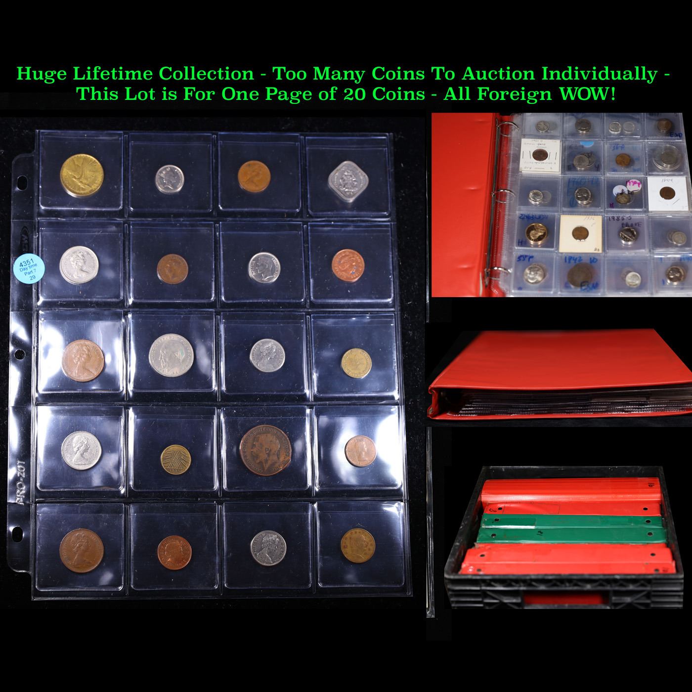 Huge Liifetime Collection - Too Many Coins To Auction Individually - This Lot is For One Page of 20 Foreign Coins. We have received a huge collection of over 10 thousand US coins in flips, 2x2 holders, and 20 coin pages. We are forced, due to limited lots, to sell this collection in pages of 20 coins. All of the pages include Silver Coins. Most contain Indian Cents, Proof Coins, Barber Coinage, Bust Coinage, Lincoln Cents, Flying Eagles, Jefferson Nickels, Roosevelt Dimes, Buffalo Nickels, Eisenhower Dollars, Kennedy Halves, Large Cents including some Draped Bust Large Cents, Mercury Dimes, and Liberty V Nickels. These pages could not be reviewed by anyone in our office due to time constraints. We estimate the value of each page to meet or exceed $200 in value! Good luck and happy hunting.