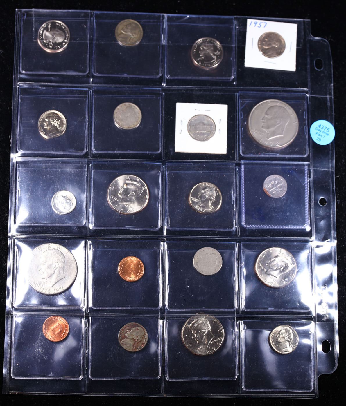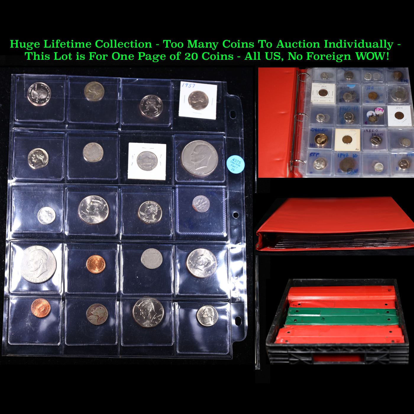 Huge Liifetime Collection - Too Many Coins To Auction Individually - This Lot is For One Page of 20 Coins - All US, No Foreign WOW!. We have received a huge collection of over 10 thousand US coins in flips, 2x2 holders, and 20 coin pages. We are forced, due to limited lots, to sell this collection in pages of 20 coins. All of the pages include Silver Coins. Most contain Indian Cents, Proof Coins, Barber Coinage, Bust Coinage, Lincoln Cents, Flying Eagles, Jefferson Nickels, Roosevelt Dimes, Buffalo Nickels, Eisenhower Dollars, Kennedy Halves, Large Cents including some Draped Bust Large Cents, Mercury Dimes, and Liberty V Nickels. These pages could not be reviewed by anyone in our office due to time constraints. We estimate the value of each page to meet or exceed $200 in value! Good luck and happy hunting.