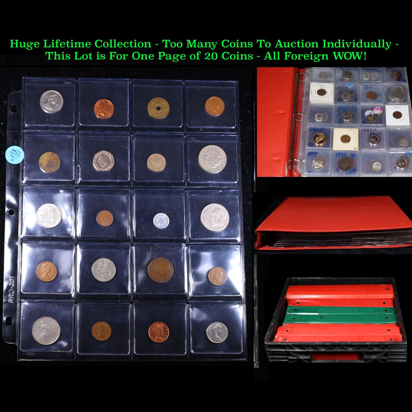 Huge Liifetime Collection - Too Many Coins To Auction Individually - This Lot is For One Page of 20 Foreign Coins. We have received a huge collection of over 10 thousand US coins in flips, 2x2 holders, and 20 coin pages. We are forced, due to limited lots, to sell this collection in pages of 20 coins. All of the pages include Silver Coins. Most contain Indian Cents, Proof Coins, Barber Coinage, Bust Coinage, Lincoln Cents, Flying Eagles, Jefferson Nickels, Roosevelt Dimes, Buffalo Nickels, Eisenhower Dollars, Kennedy Halves, Large Cents including some Draped Bust Large Cents, Mercury Dimes, and Liberty V Nickels. These pages could not be reviewed by anyone in our office due to time constraints. We estimate the value of each page to meet or exceed $200 in value! Good luck and happy hunting.