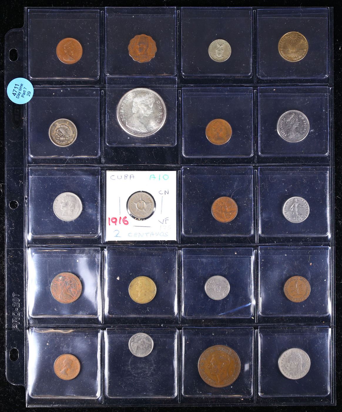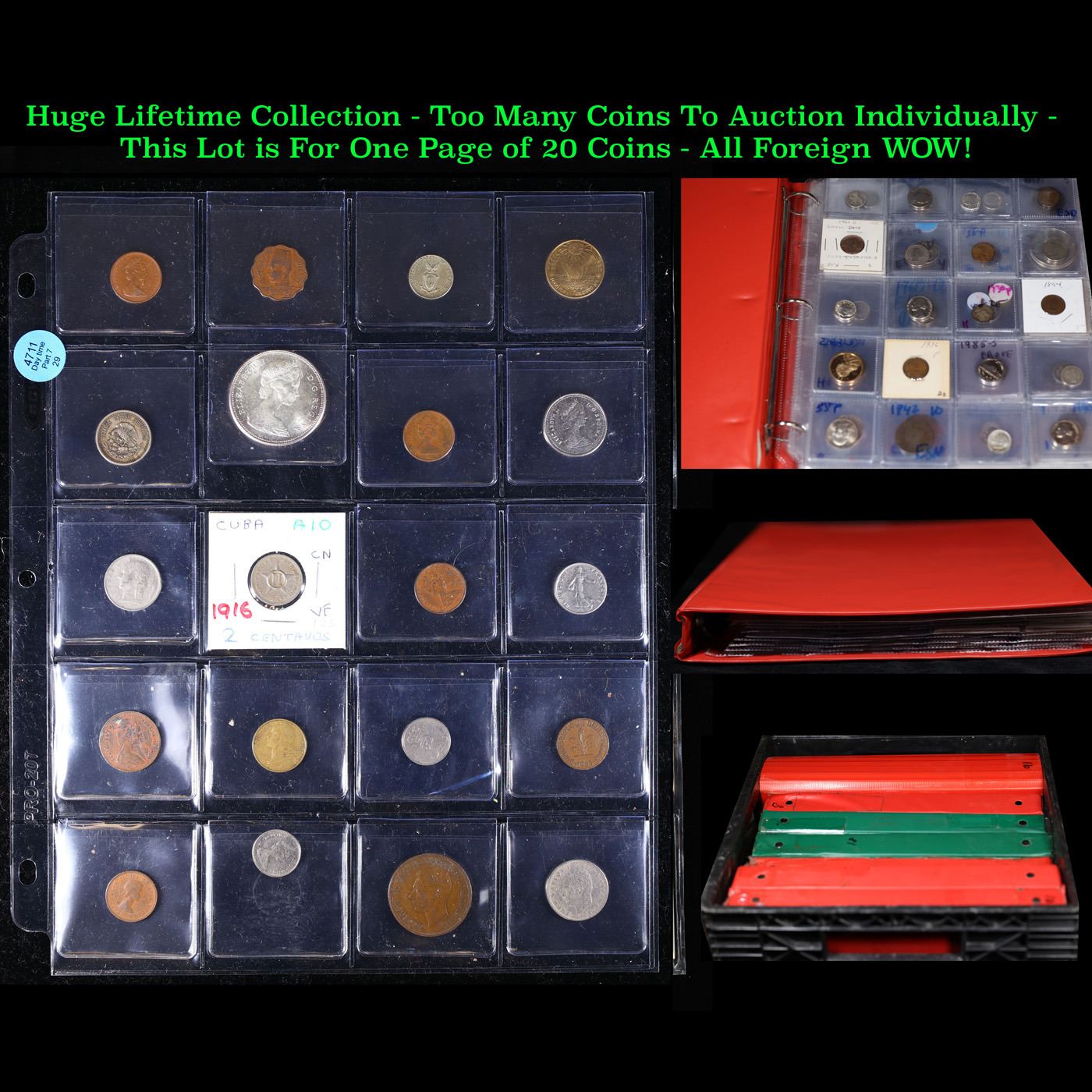 Huge Liifetime Collection - Too Many Coins To Auction Individually - This Lot is For One Page of 20 Foreign Coins. We have received a huge collection of over 10 thousand US coins in flips, 2x2 holders, and 20 coin pages. We are forced, due to limited lots, to sell this collection in pages of 20 coins. All of the pages include Silver Coins. Most contain Indian Cents, Proof Coins, Barber Coinage, Bust Coinage, Lincoln Cents, Flying Eagles, Jefferson Nickels, Roosevelt Dimes, Buffalo Nickels, Eisenhower Dollars, Kennedy Halves, Large Cents including some Draped Bust Large Cents, Mercury Dimes, and Liberty V Nickels. These pages could not be reviewed by anyone in our office due to time constraints. We estimate the value of each page to meet or exceed $200 in value! Good luck and happy hunting.